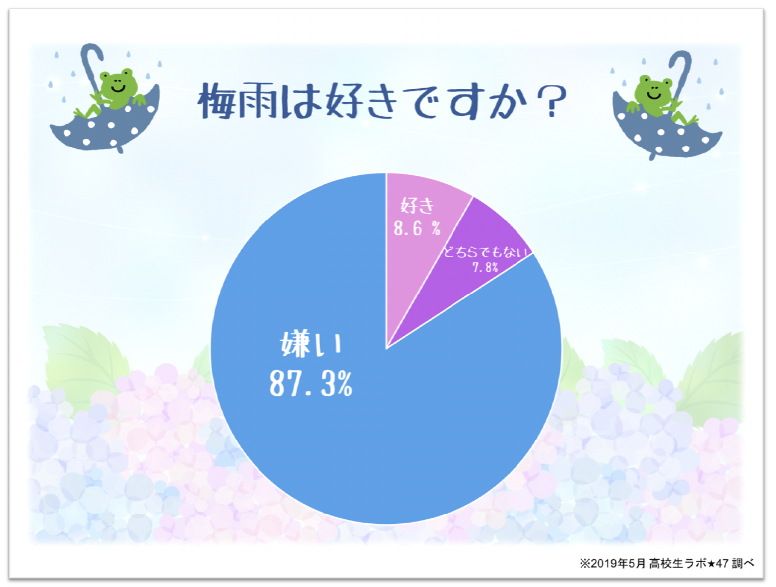 “梅雨は好きですか?”という質問では、8割以上の高校生が「嫌い」と回答しました。