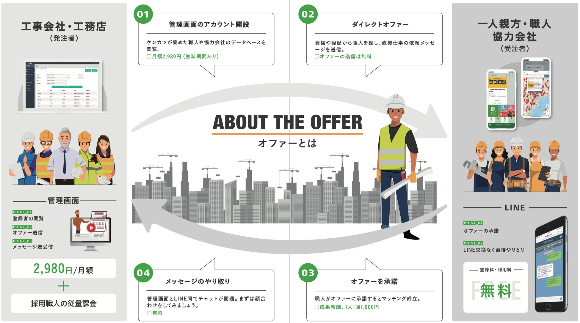 こういったオファーを送る候補者が多ければ多いほどシフトが埋まる可能性は上がります。働き手となる建設職人を公式LINEに集約し、一斉送信やダイレクトオファーを用いて建設会社と引き合わせる人材マッチングの仕組みとして「ケンカツ」を開発しました。