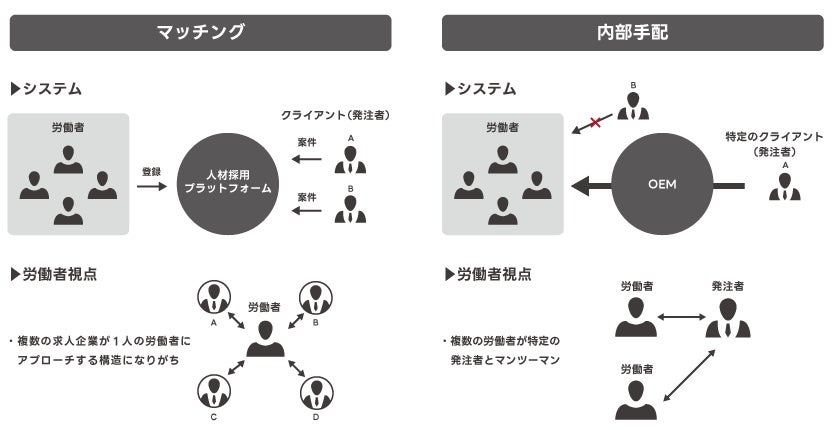 不特定多数(n)同士を引き合わせるマッチング形式との違いとしては、集めた求職者情報は自社の資産になる点、繰り返し働いてもらう時に発生していた手数料がかからない点です。