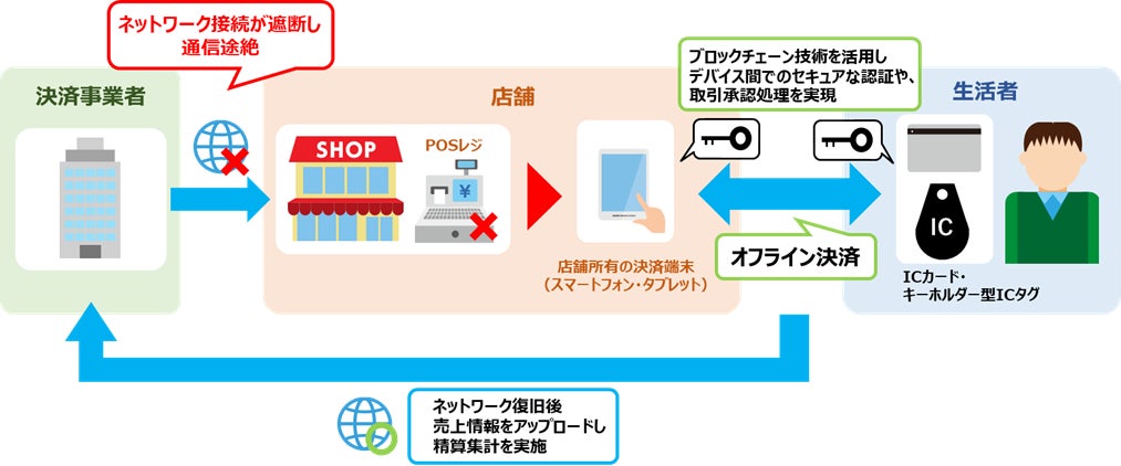 2021年11月には、NFCを活用し、スマートフォンやスマートウォッチを利用した、新たなシステムの実証実験を実施し、店頭での非接触型のモバイル決済と同様のユーザビリティを実現したことを発表しております。本システムは、外部の決済処理センターとの通信を必要とせず、デバイス間の相互認証処理やデバイスに近接した上位レイヤーのデバイス(ルーターやサーバーなど)での承認処理により、オフラインでも決済ができるシステムです。