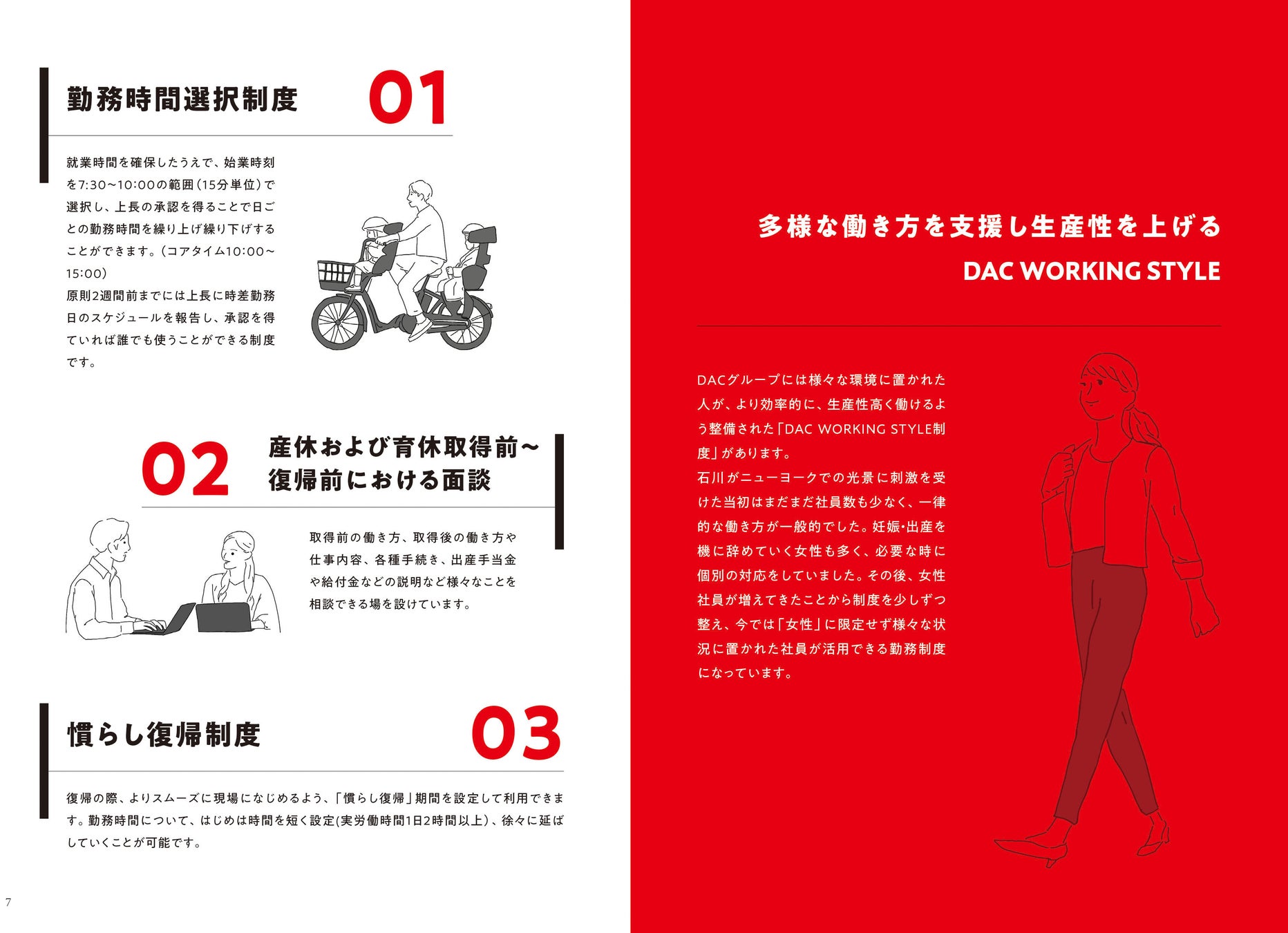 当グループの女性活躍推進の歴史、多様な働き方を支援し生産性を上げるDAC WORKING STYLE制度の紹介、人材育成について、などDACグループの核となる取り組みや、グループ各社での取り組み、28名の女性リーダー達の仕事への信念や哲学を紹介しています。