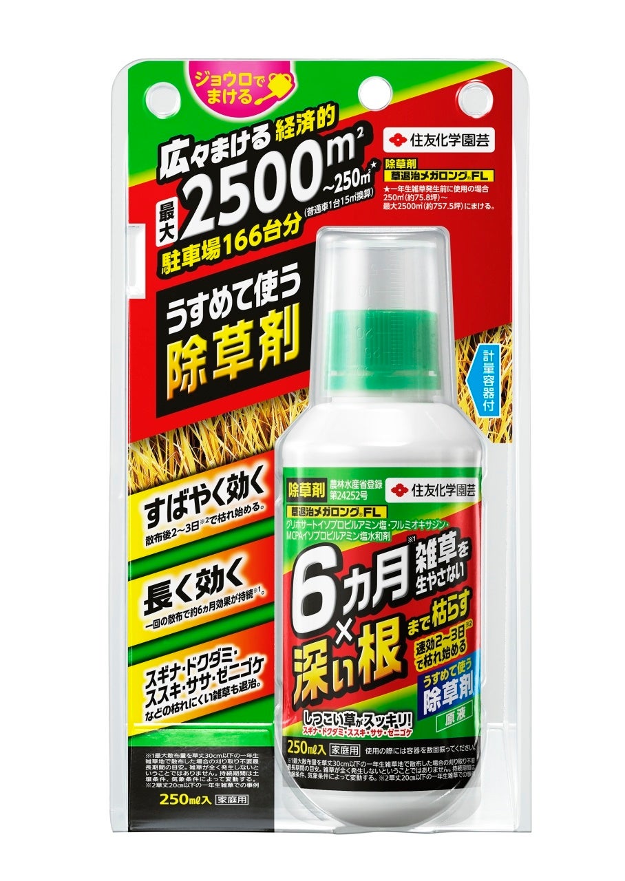 2種類の有効成分で、一年生雑草の発生を予防し、しつこいスギナなど各種雑草の葉や茎だけでなく根までスッキリ枯らします。低温でもよく効くので、春先や秋口の雑草が生えはじめる時期はもちろん、年間を通じた雑草防除ができます。