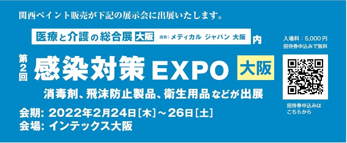 関西ペイント販売株式会社(本社:東京都 社長:寺岡 直人)は2022年2月24日(木)~26日(土) インテックス大阪にて開催される展示会〈第2回感染対策EXPO〉へ出展いたしますのでお知らせします。