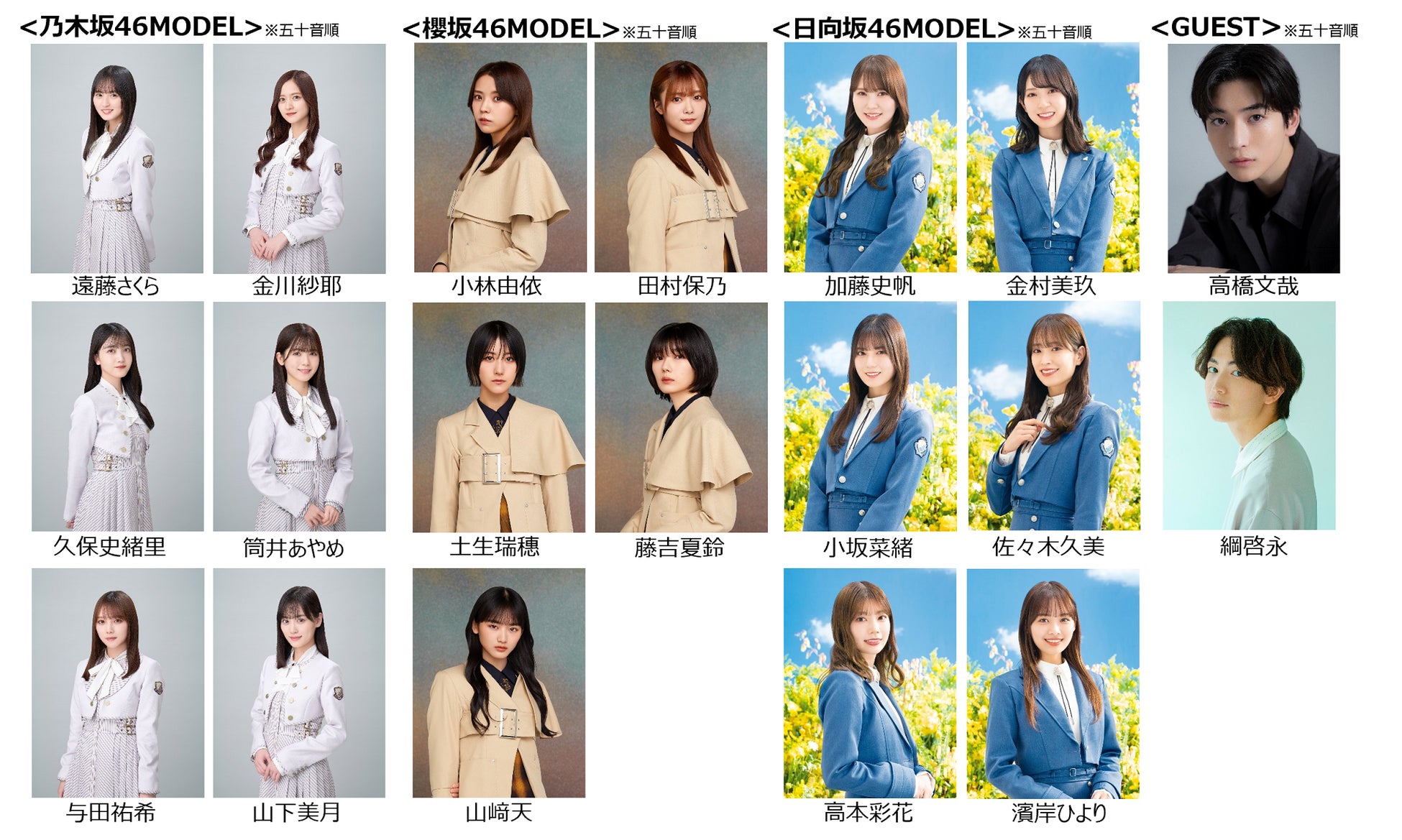 幅広い世代から人気の坂道グループから総勢17名のモデル出演が決定しました。乃木坂46からは、3月29日リリースのシングル「人は夢を二度見る」のWセンターで注目を集めた久保史緒里、山下美月をはじめ、遠藤さくら、金川紗耶、筒井あやめ、与田祐希がランウェイに登場。櫻坂46からは、歴代センターを務めた、田村保乃、山﨑天をはじめ、小林由依、土生瑞穂、藤吉夏鈴の5名、日向坂46からはキャプテン佐々木久美、センターを務めた経験のある加藤史帆、小坂菜緒、金村美玖、さらに高本彩花、濱岸ひよりが登場し、ガールズパワーでランウェイを華やかに彩ります。