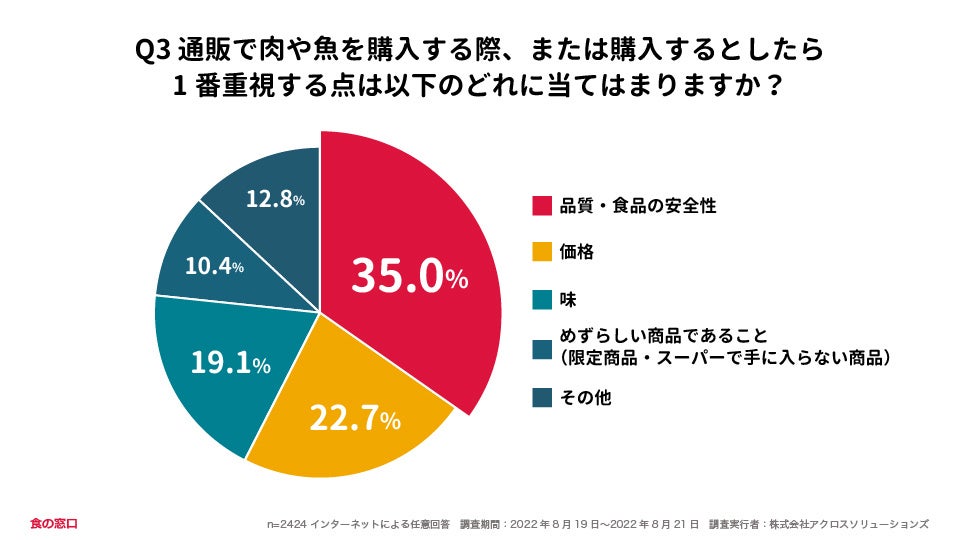 「品質・食品の安全性」が35%で最も重要視されているということがわかりました。次いで、「価格」22.7%、「味」19.1%となりました。