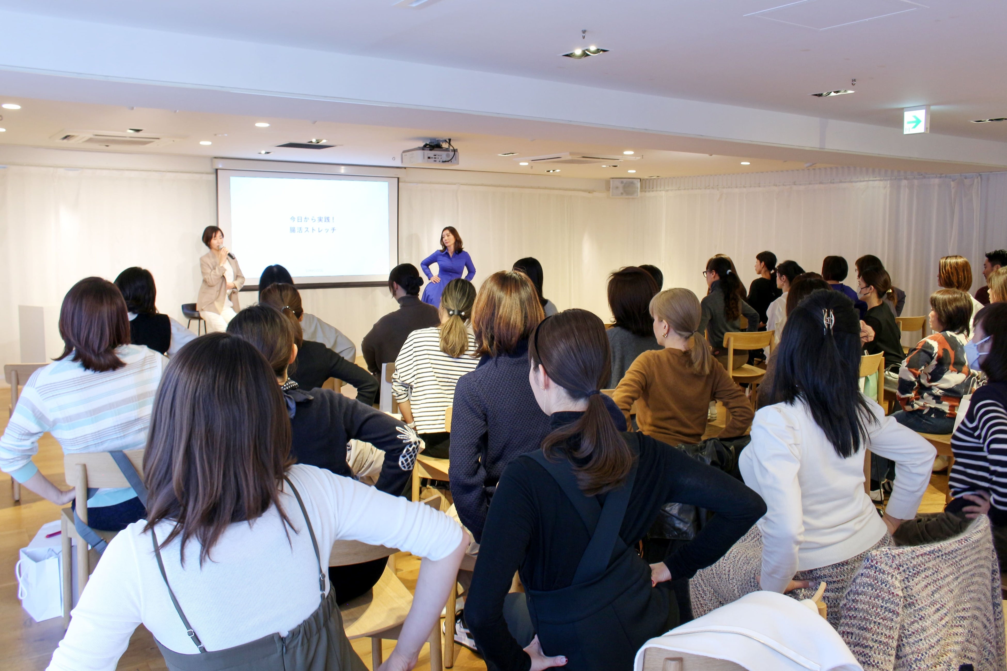 最後に、トレーナーでも山崎さんによる「腸活ストレッチ」をご来場の皆さまとともに行い、適度な運動を日頃から心がけることも、腸内環境の安定につながると話しました。