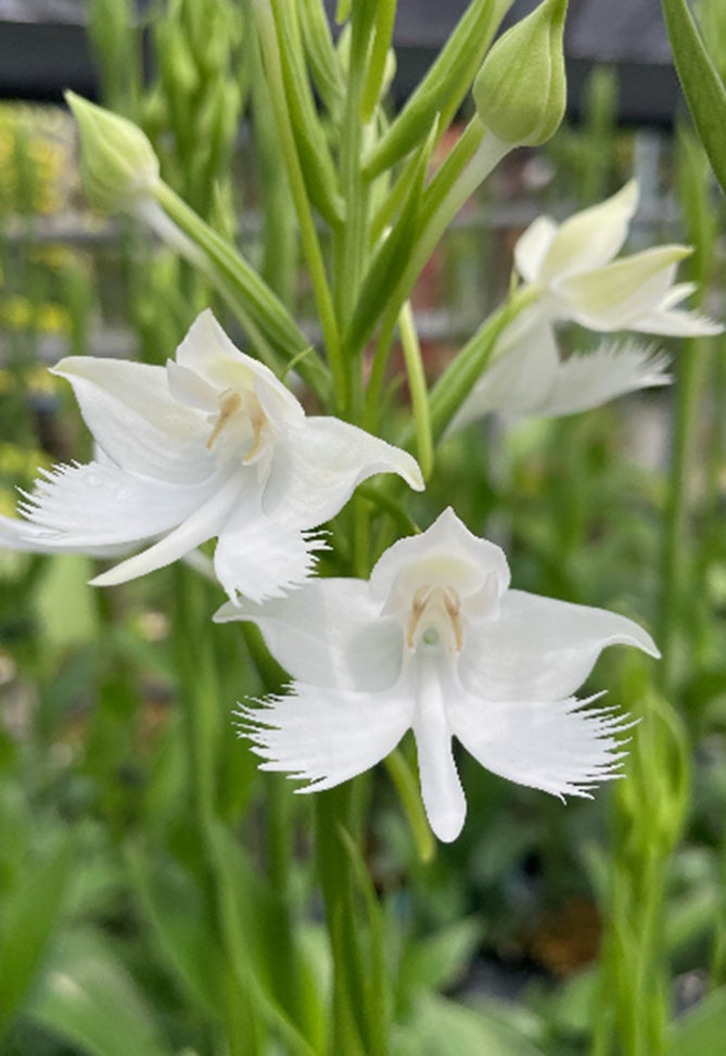 「ペクタベナリア ホワイト グリフィン」はダイサギソウとペクテイリス スザンナエ(Pecteilis susannae)の交配種で、2023年9月に英国王立園芸協会に登録されたばかりの新しいランです。花はシラサギが舞うように純白で美しく、ダイサギソウの2倍程度の大きな花を咲かせるため、華やかで見ごたえがあります。