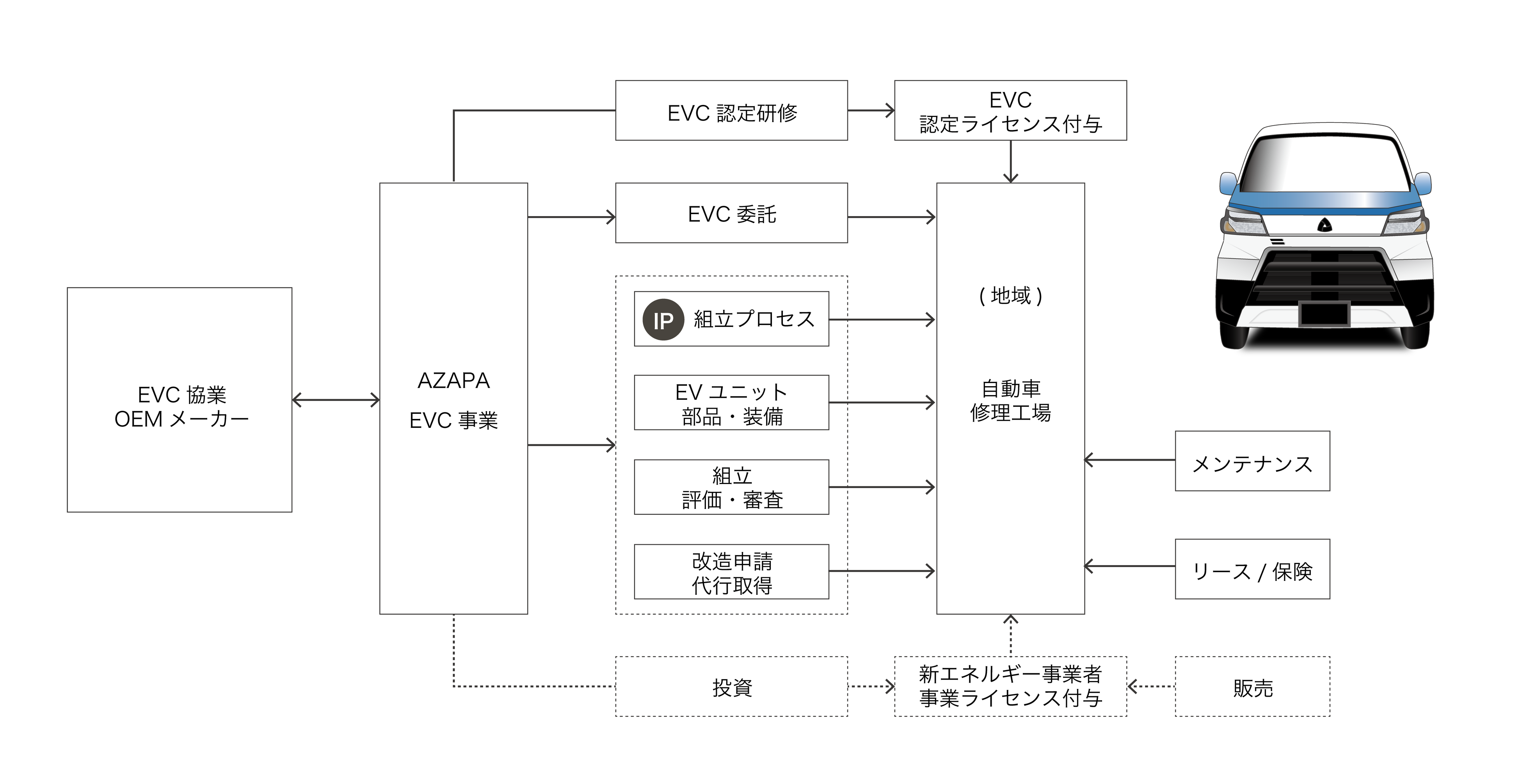 AZAPAの考える経済循環は、エネルギーとモビリティの融合と移動による経済活動の維持、成⻑です。単にEVCを提供することではなく、地域の経済圏の⾃⼰成⻑をエネルギーとモビリティで⽀えることにあります。今回、提供するEVCは、地域の⾃動⾞の修理⼯場などで、簡単に改造、メンテナンスできる仕組みを持ち、ファブレスでの受注⽣産を⾏います。地域が限定的であれ、分散型電源でのエネルギー需給が主⼒化すると、これまでのエンジンやその他システムのメンテナンスではなく、電気システムのメンテナンスを⾏う⼈材も必要となってきます。このような必要性に政策ではまだ不⼗分な部分に対して、EVC事業が具体的な解決策になると考えています。EVCをAZAPAから委託製造することで、電気システムのメンテナンス技術や設備・環境を構築することができ、新たなビジネスを獲得する機会を提供します。また製造委託からEVC 事業のライセンスを付与した事業者は、製造及び関連するプロセス、部品をAZAPA から購⼊し、事業を継承することが可能で、地域の新エネルギー事業者が、⾃社のエネルギー事業と合わせて推進すれば、地域エネルギーの再エネ導⼊を拡⼤する機会につながります。