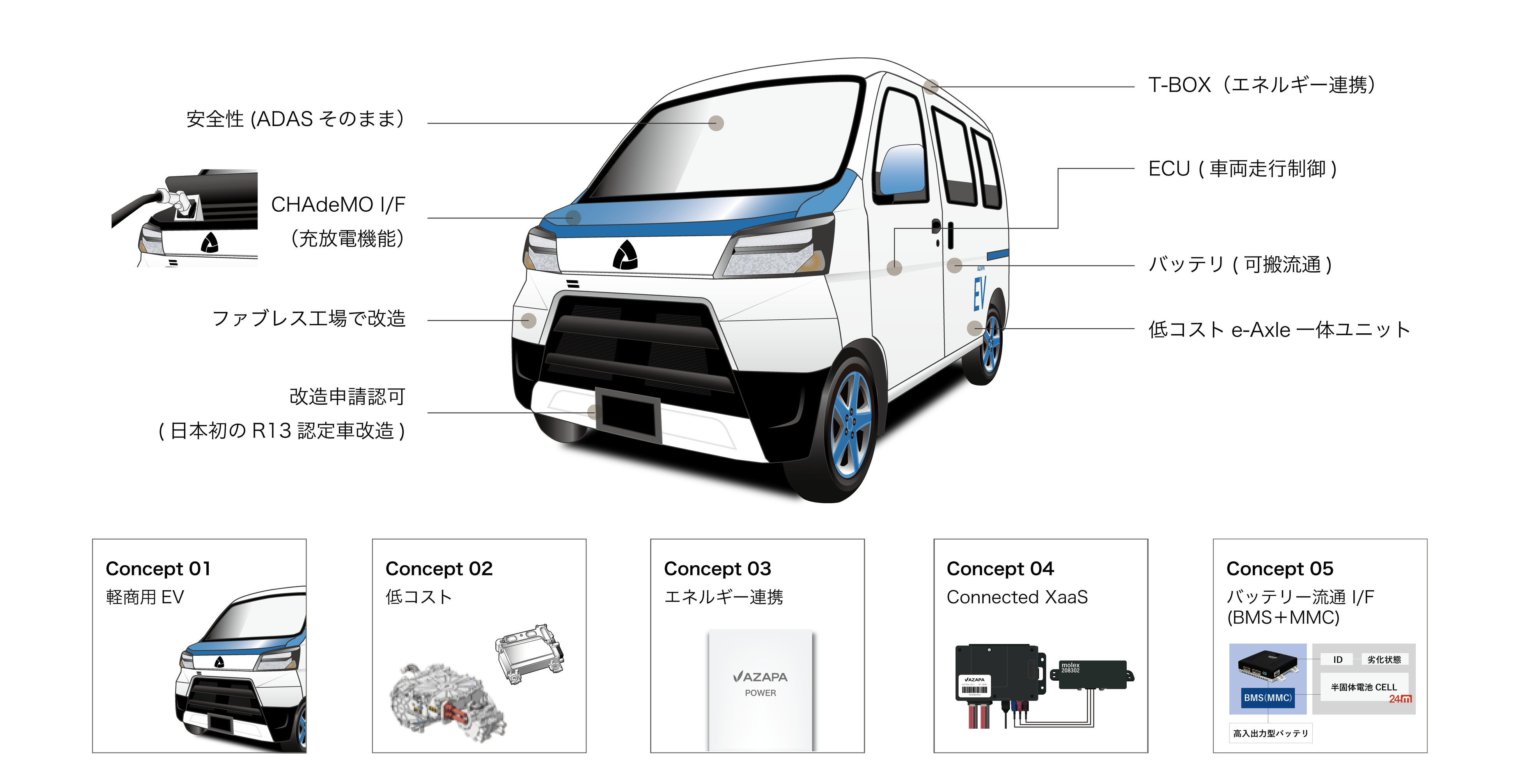 EVCは、今後、エネルギーとモビリティの融合を先⾏した、新たなインターフェースを獲得し、新たな創出市場を促進するための基本機能を装備してゆきます。例えば、バッテリーの流通性において、形状や性能におけるバッテリー標準化やリサイクル性は、まだまだ未開拓な市場です。AZAPAのEVCでは、基本機能として、IoTデバイス(TBOX)を搭載し、独⾃の統合バッテリーマネージメントシステム(BMS)により、バッテリーの性能劣化を少なくし、寿命を伸ばすことで、バッテリー残価を正しく評価して、リセールバリューと流通性を⾼めるなど、新たなエネルギー市場への連携を可能としてゆきます。