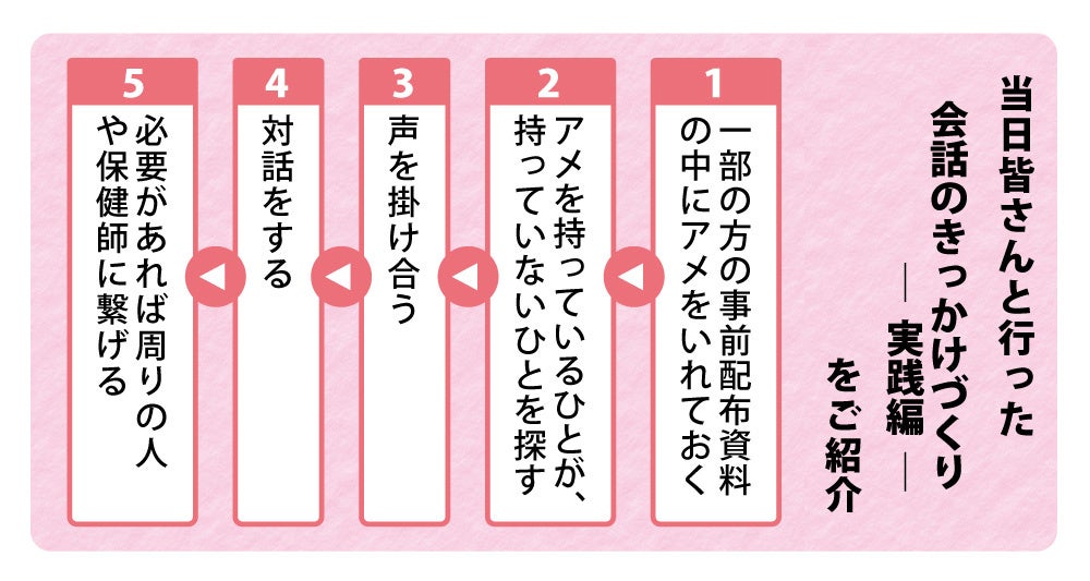 勝央町で行った研修では「地域で見守るメンタルヘルス-やさしい心配りとサポート-」というテーマのもと、参加者は「きっかけドロップス」を使った体験型ワークを通して、ゲートキーパーの役割である「気づく・声をかける・聞く・繋げる・見守る」を実践的に学びました。具体的には、「きっかけドロップス」を持っている人が、持っていない人を探し、「アメ食べる?」と声をかけることで自然な会話のきっかけを作るというものです。これにより、普段の生活の中で「大丈夫?」と直接尋ねる心理的なハードルが高いと感じる方でも、気軽に人との交流を始める第一歩を踏み出すことができます。