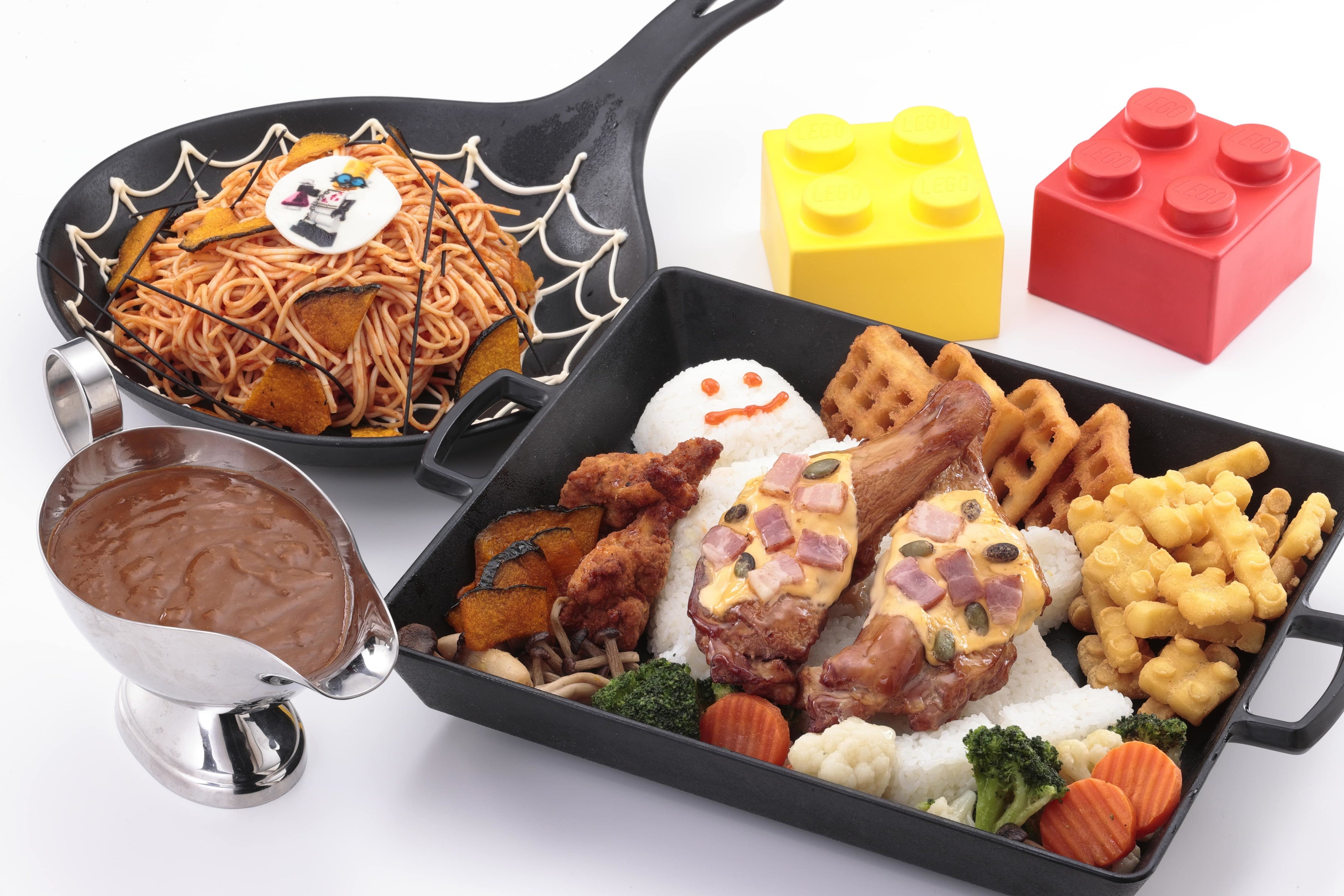 骨付きチキンとお好みで甘口と辛口が選べるカレーのファミリーセット。 定番レゴポテト、カボチャチップやキノコなど秋の食材と一緒に楽しもう!