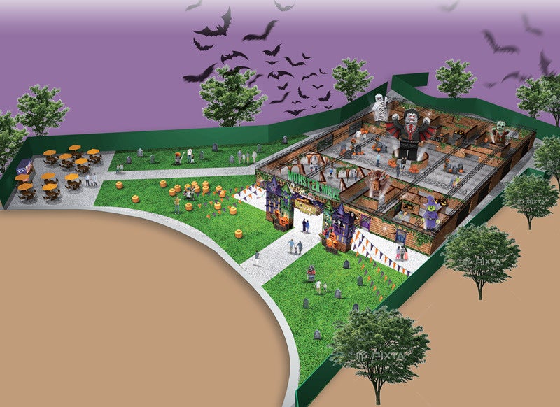 パーク中央のイベントスペースに巨大な迷路(34×22m)が期間限定で登場!ジャイアントパンプキンやモンスターたちに 囲まれた全長約10mの「モンスターゲート」をくぐり、「トリック・ルーム」もしくは「ミラー・ルーム」のどちらかから迷路を進もう。「トリ ック・ルーム」に入ると目と耳でも楽しめる、少しドキッとするような迷路体験をご用意。また、「ミラー・ルーム」は、鏡に囲まれた迷 路を進む不思議な空間で、鏡の凹凸によってお子さまの姿が変化して映る仕掛けをお楽しみいただけます。モンスターにジャック された迷路を抜けた先には、レゴ ブロック約15万個で作られた高さ3.5mの巨大ヴァンパイア像(日本初登場)が出現。