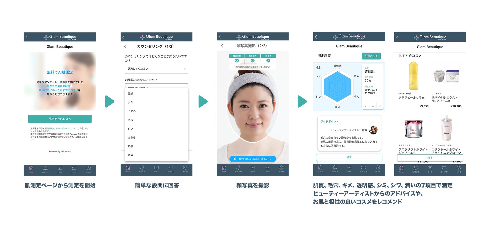 ビューティアーティストからのアドバイスコメントのほか、自分と似た肌データのユーザーの行動情報(購買データ)を、AIが学習・分析し、一人ひとりに最適な「おすすめアイテム」を予測して提示します。