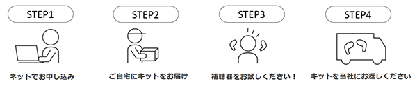 オンラインでかんたん申込み、試聴用補聴器キットが自宅に届き、約1ヵ月プライベートで、ビジネスで、趣味の場でじっくり試していただけます。お試し後は宅配便で返すだけです。離れて暮らすご家族に補聴器体験ギフトとしてプレゼントすることも可能です。