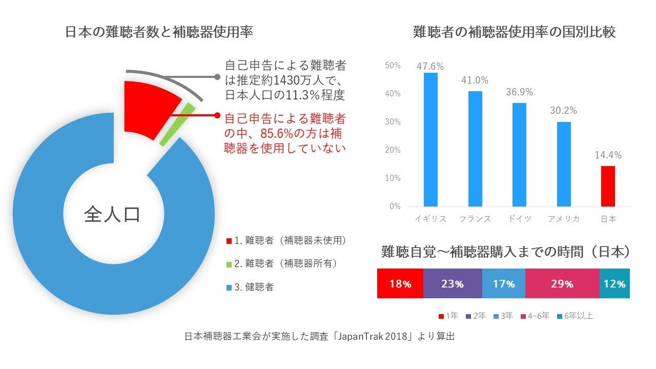 日本の補聴器の普及率は、難聴者人口の14.4%に留まっており、欧米諸国の普及率30~40%に比べて非常に低い水準となっています。また日本では、難聴を自覚してから補聴器装用までの時間は平均4年~6年で、補聴器装用を開始するのは75歳を超えることが多いのが現状です。