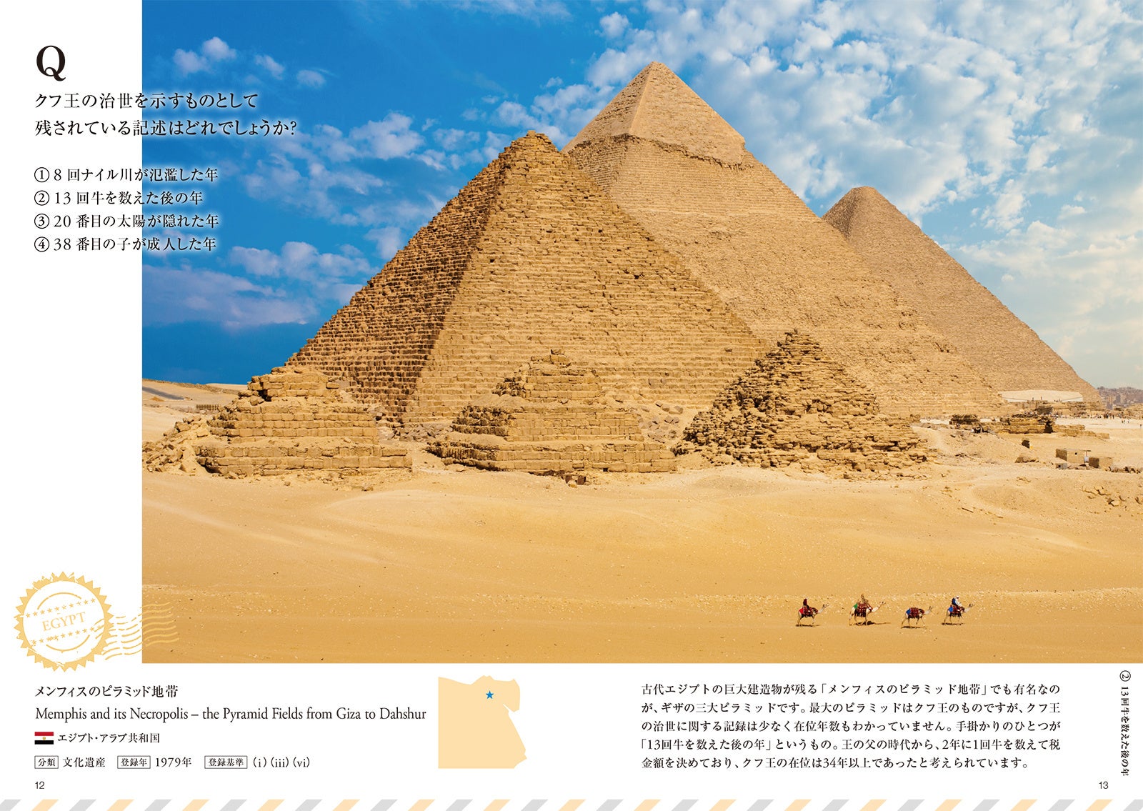 また日本の遺産をはじめ、「ローマの歴史地区」や「メンフィスのピラミッド地帯」などの世界的な観光地として有名な遺産、日本から遠く離れた知られざる遺産まで、各地の世界遺産50件を取り上げ、世界を旅するように巡ることができます。