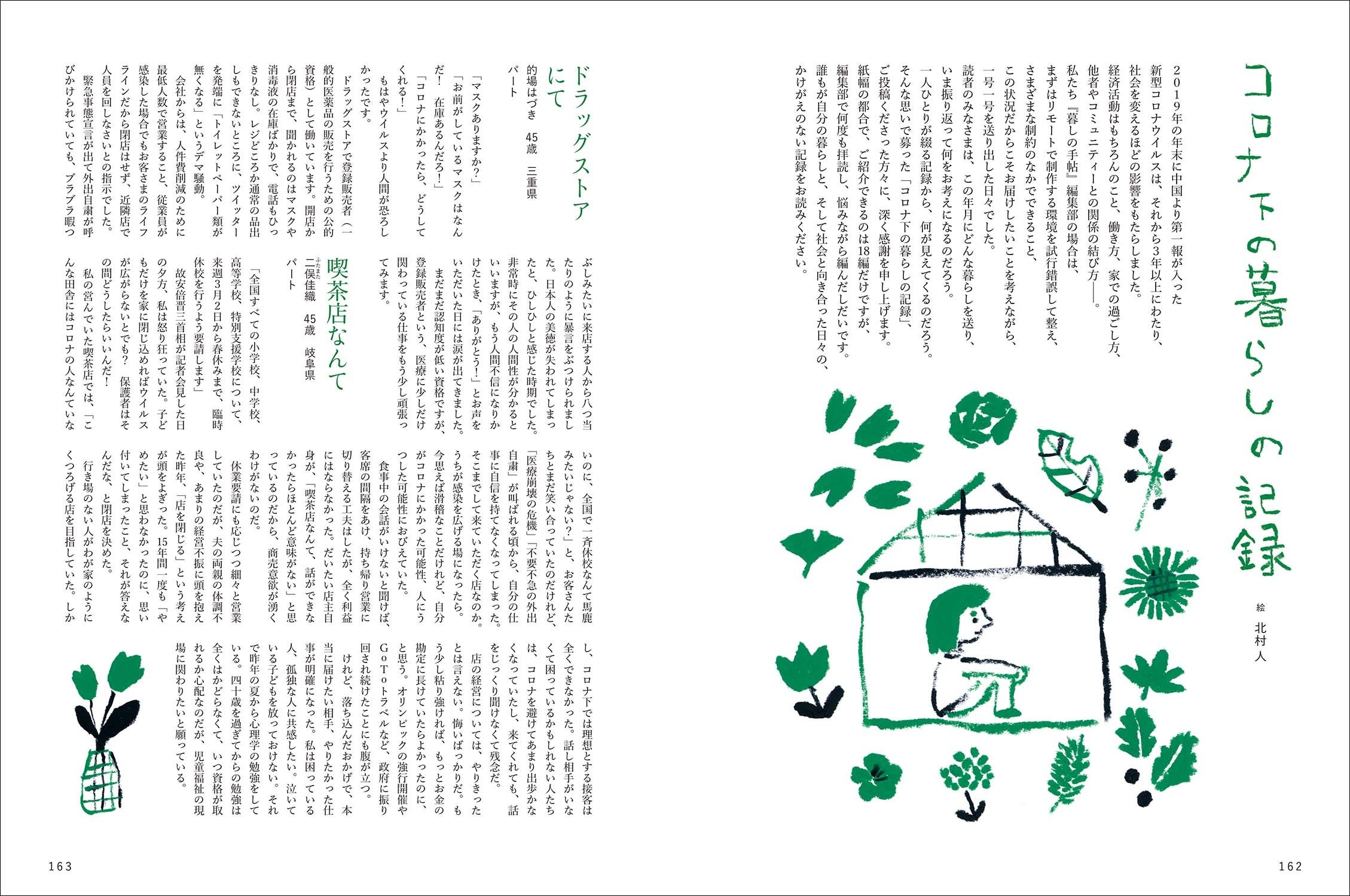 第四特集「コロナ下の暮らしの記録」は、読者の皆さまから投稿を募りました。記憶に新しい「コロナ下」は、一人ひとりにとってどんな日々だったのか。誰もが自分の暮らしと社会に向き合った、かけがえのない記録です。