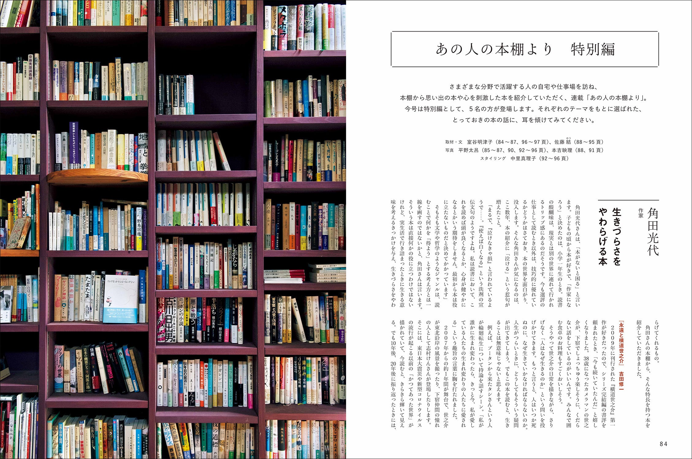 第三特集「あの人の本棚より 特別編」は、人気連載の特大版。角田光代さん、五味太郎さん、益田ミリさん、安田登さん、しりあがり寿さんの「本棚」が登場します。