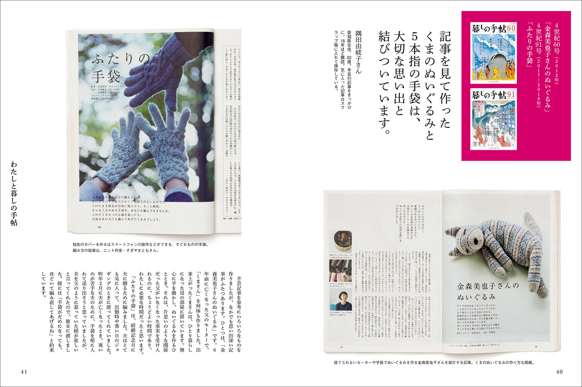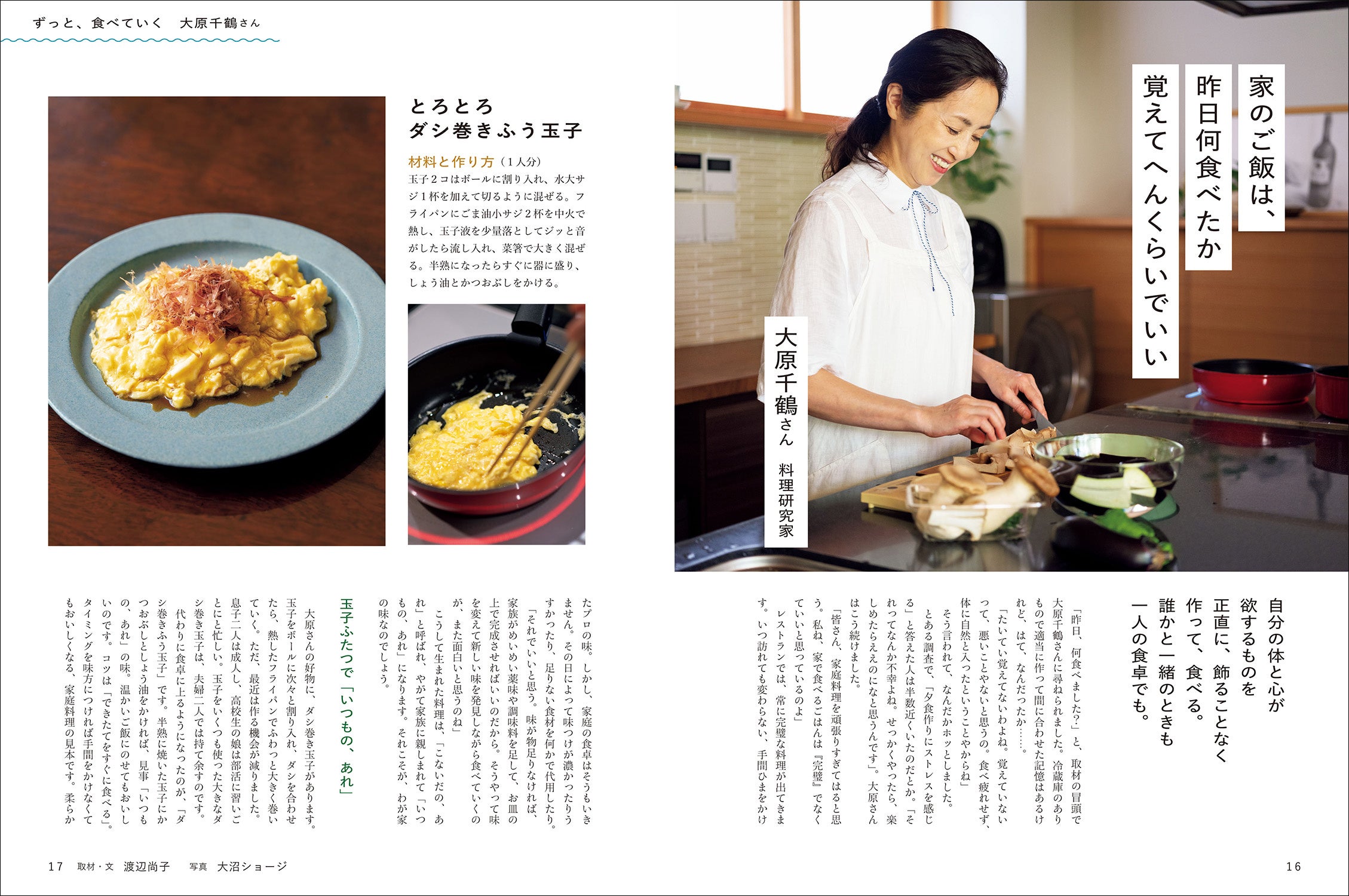 第一特集「ずっと、食べていく」は、さまざまな情報が溢れるなかで揺らぎがちな「家のごはんで大切なこと」を掘り下げました。大原千鶴さんや本田明子さんほか6名が、実生活の食事作りで直面した困難や喜びなどを語る読み物と、それに結びついた料理レシピという構成で、読者が「自分なりのよりどころ」を見いだすヒントをちりばめています。
