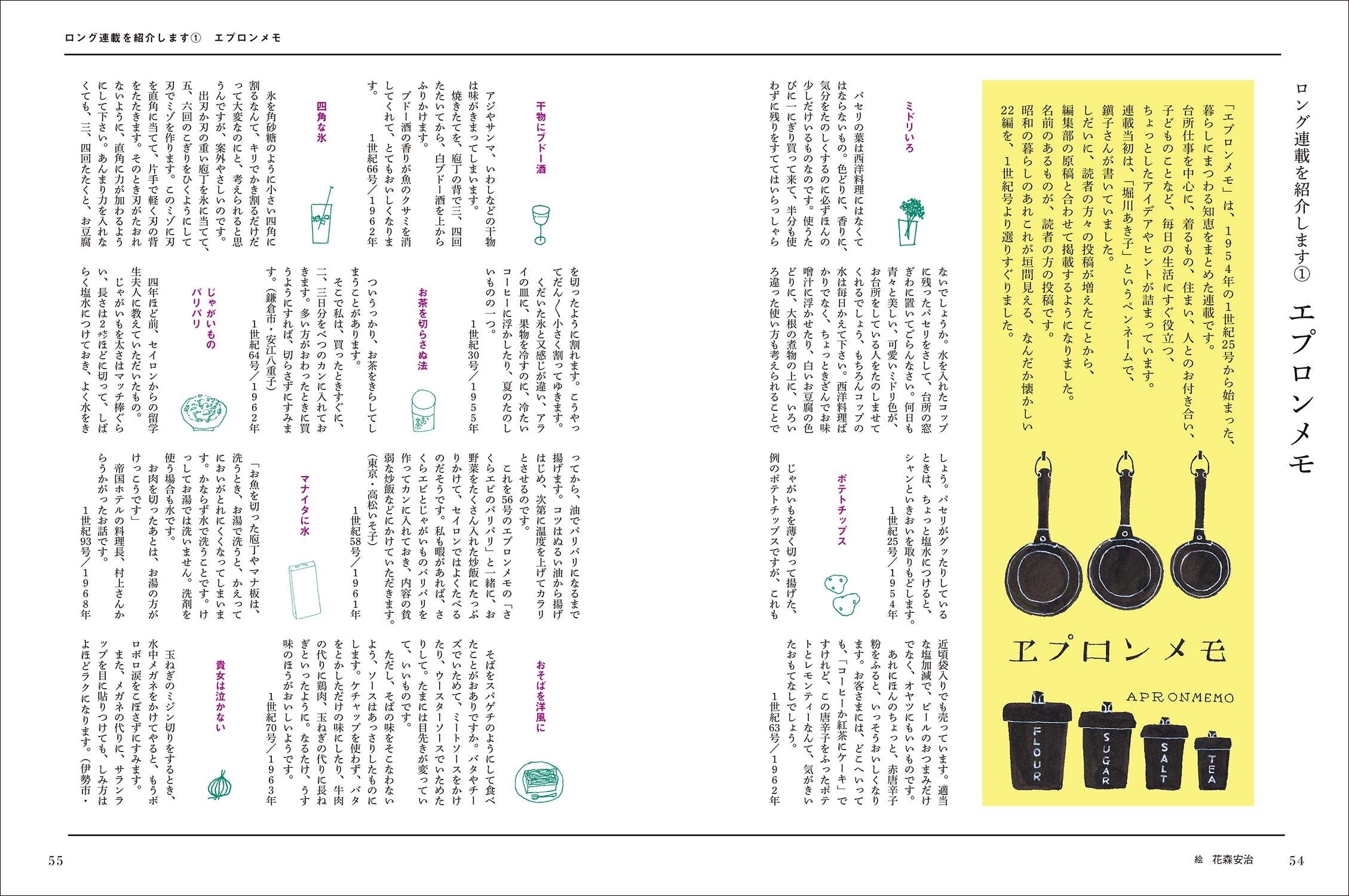 他にも、ロング連載の秘話や誌面を収録しています。1954年に連載開始した『エプロンメモ』からは、昭和の暮らしが垣間見える22編をご紹介。