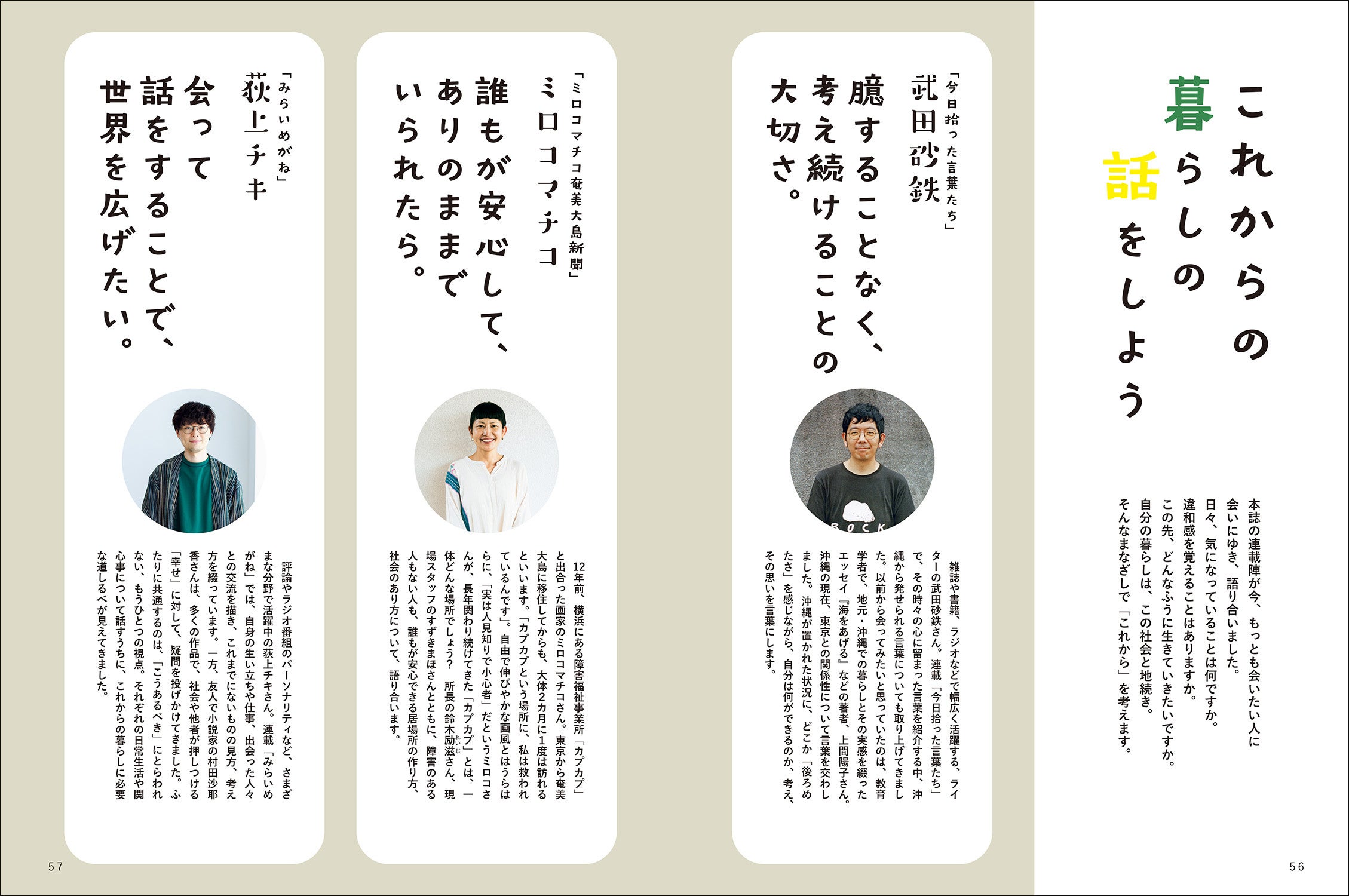 第二特集「これからの暮らしの話をしよう」は、人気連載の執筆陣であるライターの武田砂鉄さん、画家のミロコマチコさん、評論家の荻上チキさんが、「いま会いたい人」を訪ねて語り合う対談(鼎談)記事。暮らしや社会を取り巻くいろいろなトピックに理解が深まり、「社会がもっと居心地よくあれば、暮らしはきっと心地よくなる」、そんな読後感をおぼえることでしょう。