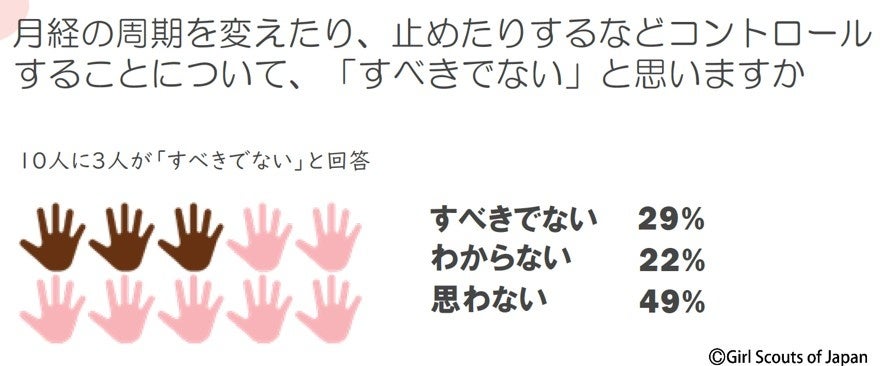 - 月経の周期を変えたり止めたりするなどコントロールすることについて、すべきでないと回答したのは29%、わからないと答えたのは22%