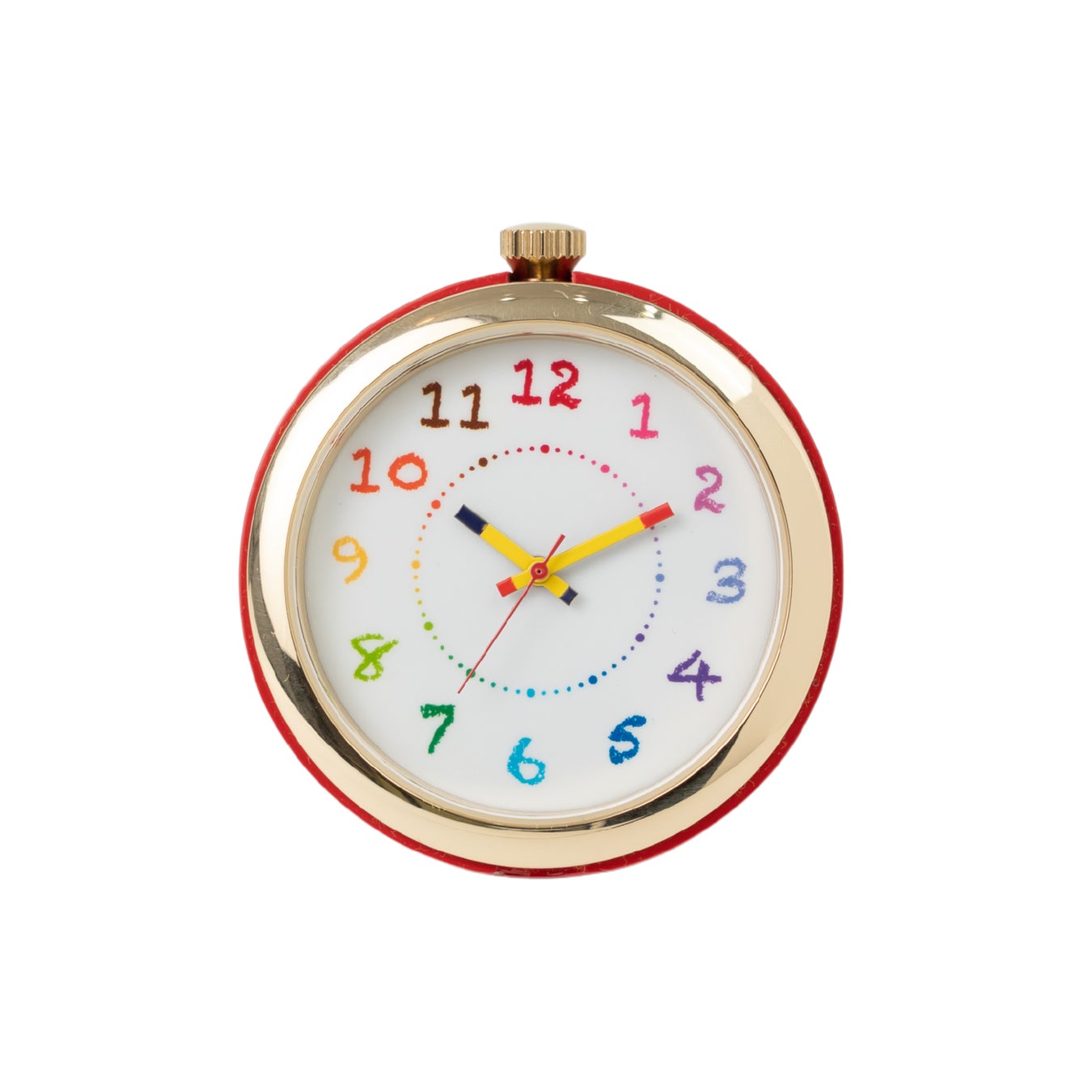 真っ白の文字盤に、カラフルなインデックスで時間が見やすいデザイン。