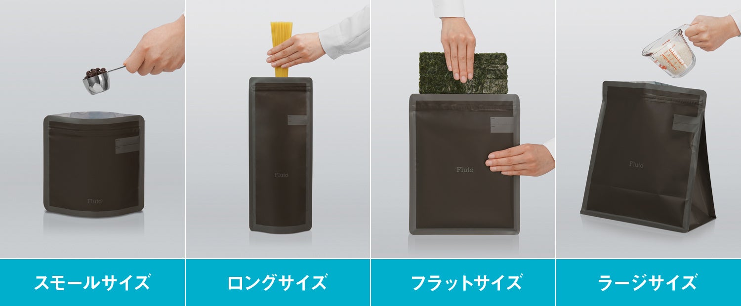 Fluto食品保存袋は、用途に合わせて選べる4サイズ展開。スモールサイズはお米やコーヒー豆に、ロングサイズは乾麺に、フラットサイズは海苔やパンに最適。すべて統一感あるデザインで、キッチン全体をすっきりと整える収納アイテムとしても活躍します。