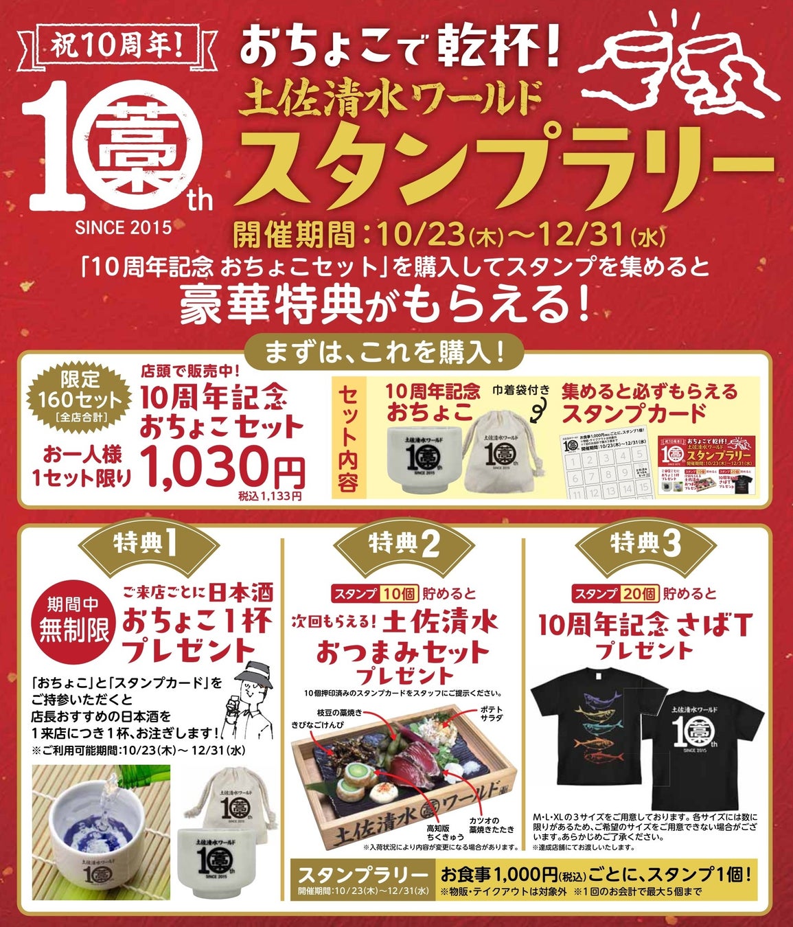 10周年祭イベントと同時に、店舗メニューのリニューアルや10周年限定おちょこスタンプラリーを実施するほか、産地を訪ねる「土佐清水ワールド10周年感謝ツアー」等、様々な企画で節目の年を盛り上げることにしております。
