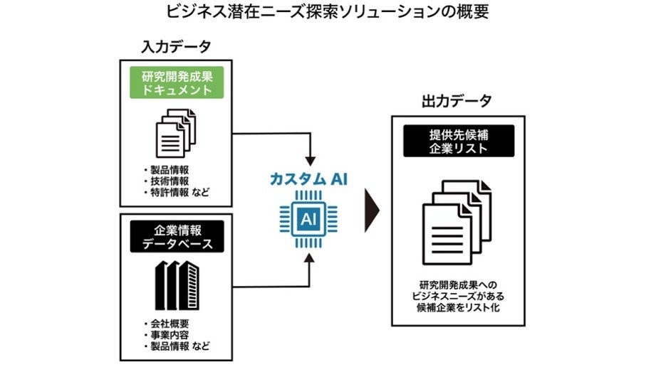 本ソリューションは、研究開発の成果として誕生した新製品や新技術の情報を記したドキュメントを入力データに、企業データベースから関係性の高い候補を発見し、ビジネスニーズを保有すると考える企業リストを抽出作成することを企図したソリューションです。属人化されやすく人手では限界があった研究開発成果の提供先企業の探索に係る業務の効率化と最適化に本ソリューションが貢献することが期待されます。