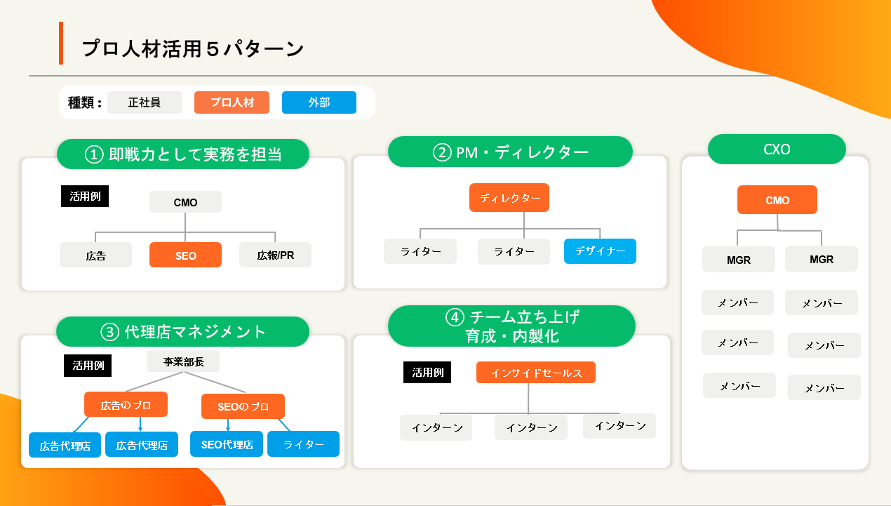 特にマーケティング領域を強みとしており、広告運用、SNS、SEO、オウンドメディア 、動画、広報・PRなど施策が多様化、高度化する中で、スキルと実績の豊富なマーケティングプロ人材を戦略から実務まで必要なボリュームでアサインすることができます。