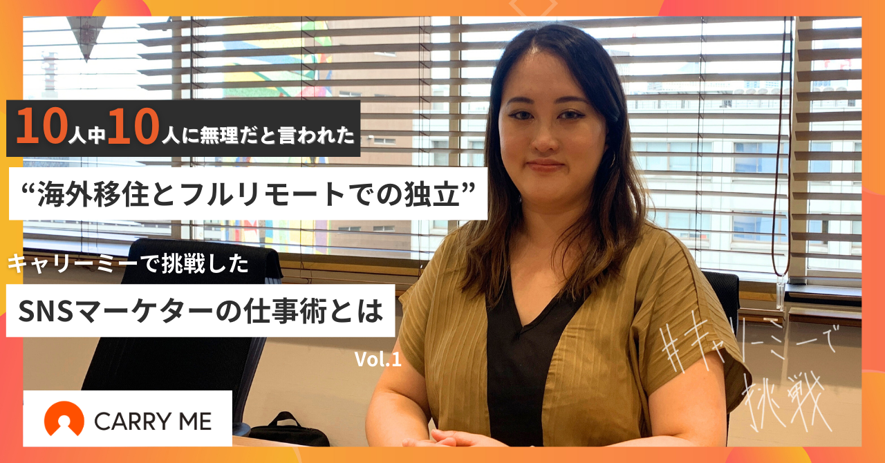 業務委託を活用されていない企業様や独立間もないプロ人材の方々にとっても、プロとして業務委託で契約することは挑戦の一つと言えます。企業様・プロ人材の方それぞれの挑戦をすぐそばで見てきたキャリーミーが、その挑戦のストーリーをご紹介していきます。第一弾として、海外移住の夢を実現しながらフルリモートでの独立を果たしたSNSマーケターのプロ人材をご紹介しています。