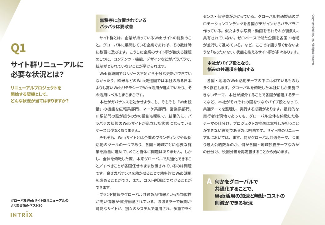 BtoBのグローバルサイト構築や運用においては、グローバルな視点に則ったルールや注意点が存在します。そこでこの冊子では、代表的な質問を20個ご用意しました。特に議論すべきポイントや、課題に焦点を当てて解説しています。