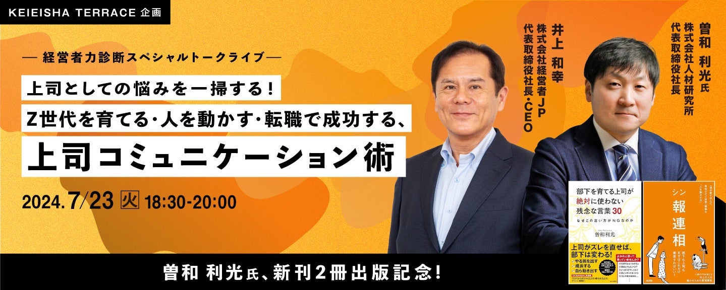 「経営者力診断スペシャルトークライブ:上司としての悩みを一掃する!Z世代を育てる・人を動かす・転職で成功する、上司コミュニケーション術」7月23日(火)18:30~開催