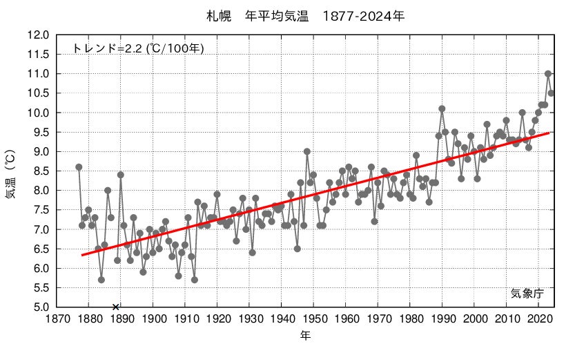 札幌管区気象台の調査によると、札幌管内の年平均気温はさまざまな変動を繰り返しながらも上昇傾向が明らかで、100年間で2.2℃以上高くなっています。