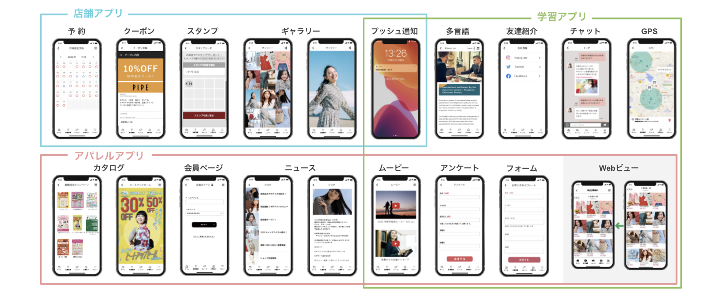 例えば、飲食業や美容業であれば、予約・クーポン・スタンプなどを組み合わせて店舗アプリとして使用することが可能となり、学校や学習塾であれば、チャットとムービーを組み合わせて学習アプリとして活用することができます。