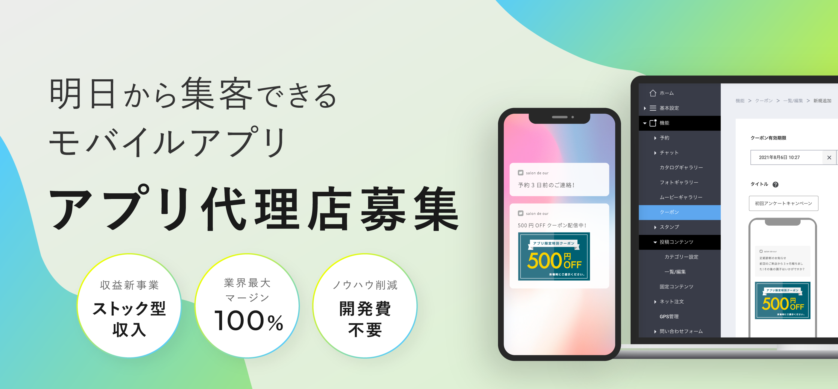 また、リニューアル前もご用意しておりましたapplimo(アプリモ)を販売・制作するFC代理店、自由なブランドで販売・制作が可能なOEM代理店も継続で展開いたします。