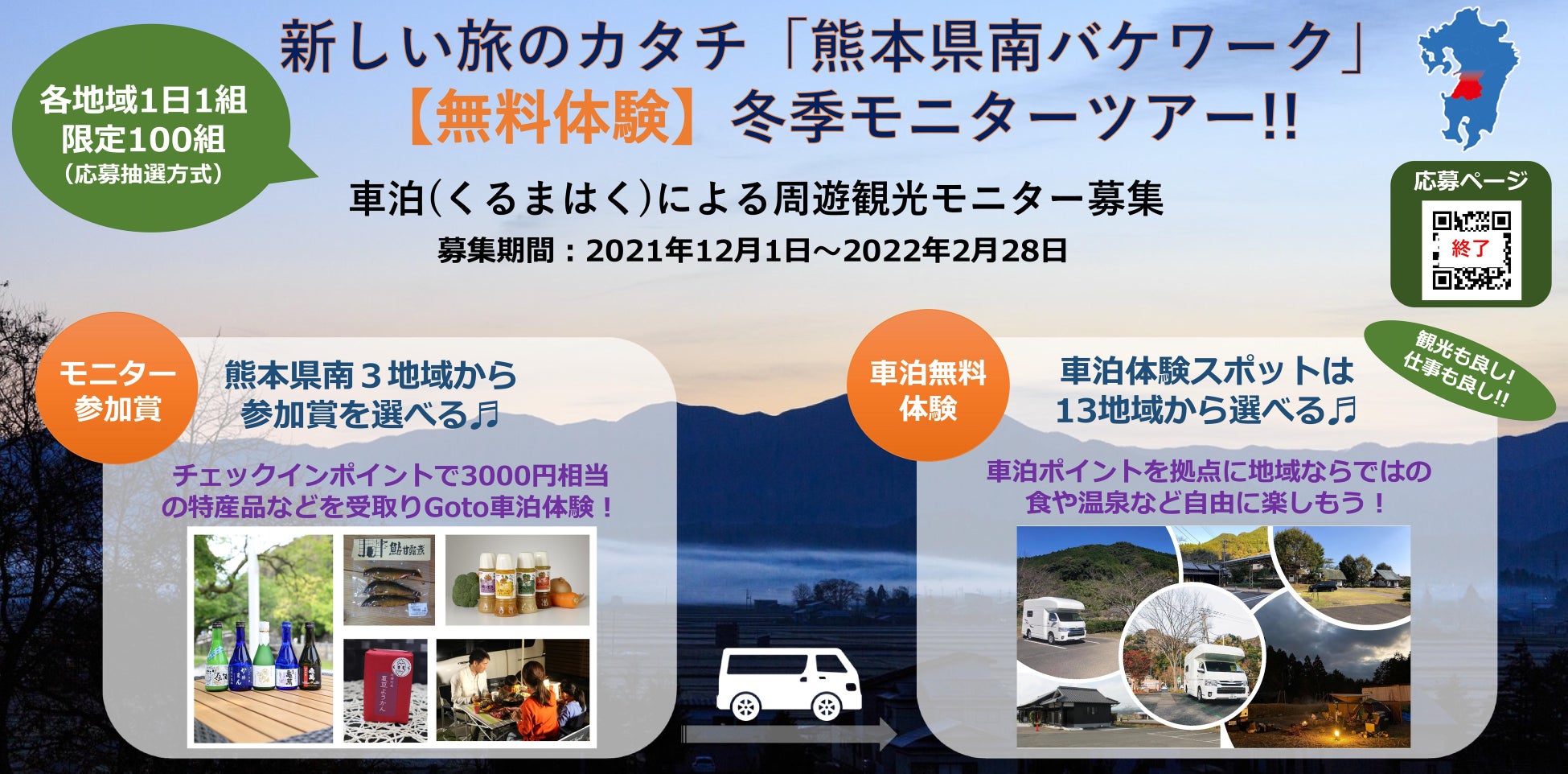 九州を中心に新しい旅のカタチ「車泊(くるまはく)」を展開(※1)している九州周遊観光活性化コンソーシアム(代表機関:トラストパーク株式会社 本社:福岡県福岡市博多区、代表取締役社長:山川 修、以下「当社」)は、九州アイランドワーク株式会社(本社:宮崎県宮崎市 代表取締役社長:馬渡 侑佑)と連携し、津奈木町や錦町など熊本県南の15市町村の未利用スペース等をシェアリング活用して、ワーケーション及び車泊実証地をつなぐバケワーク(※2)の実証実験を行いました。