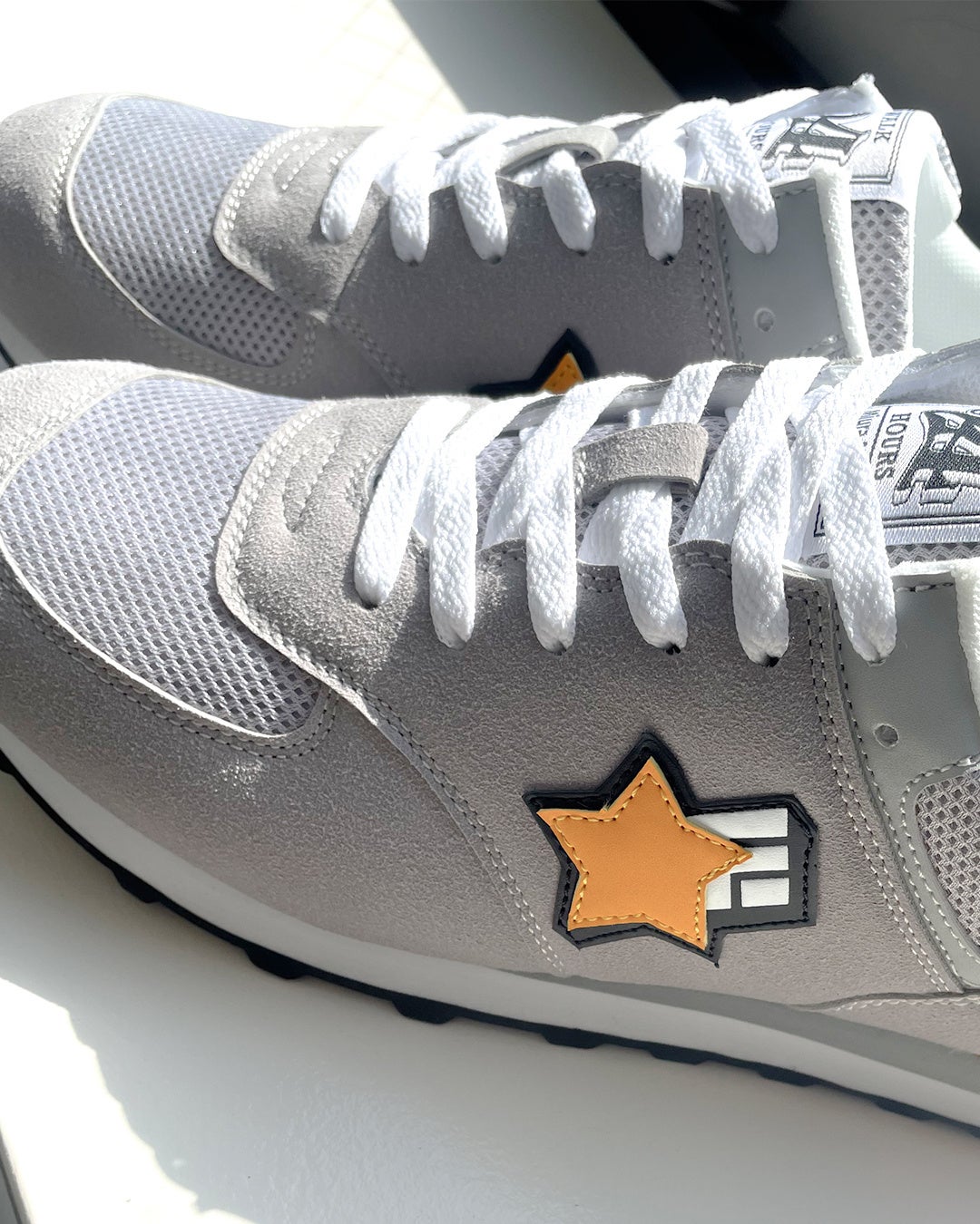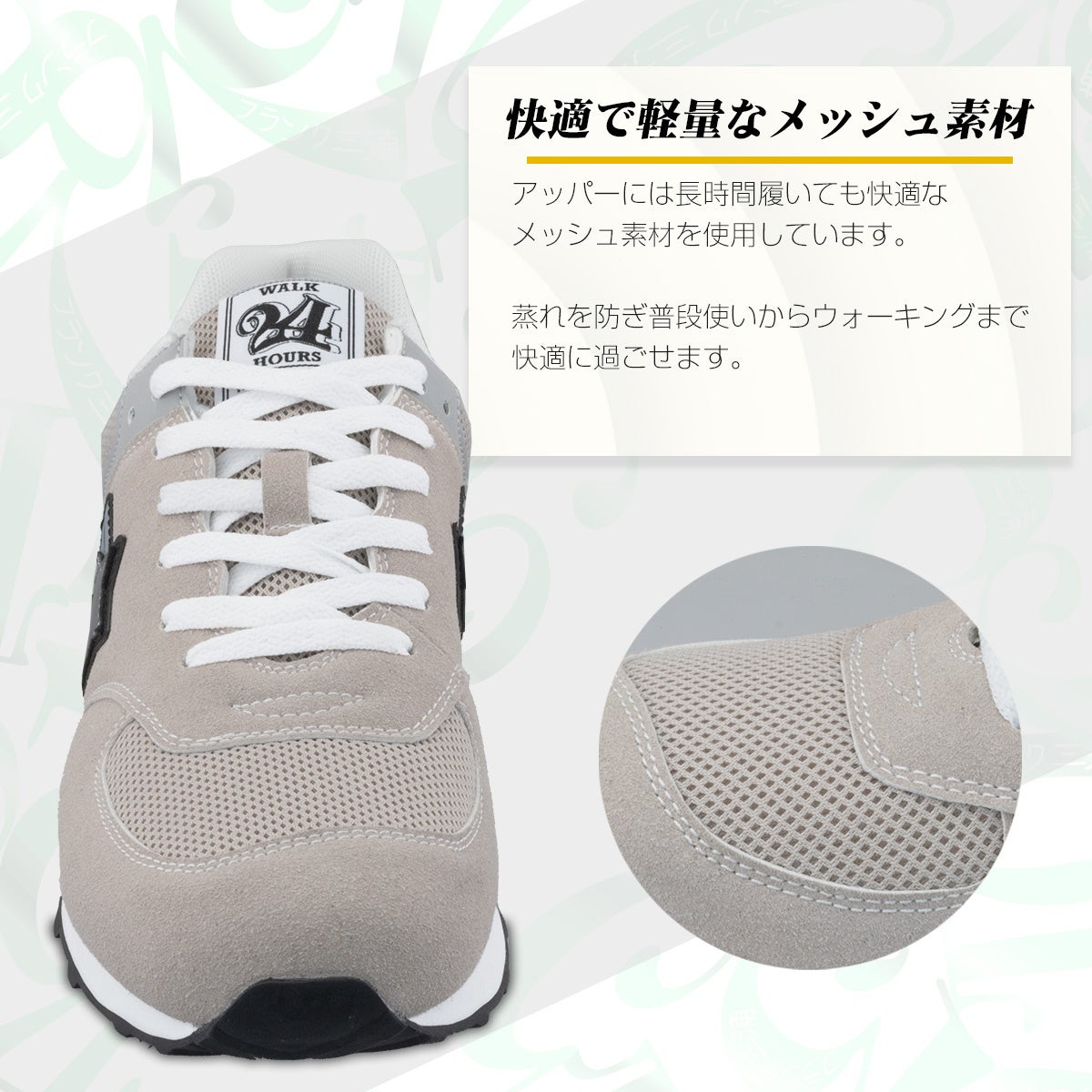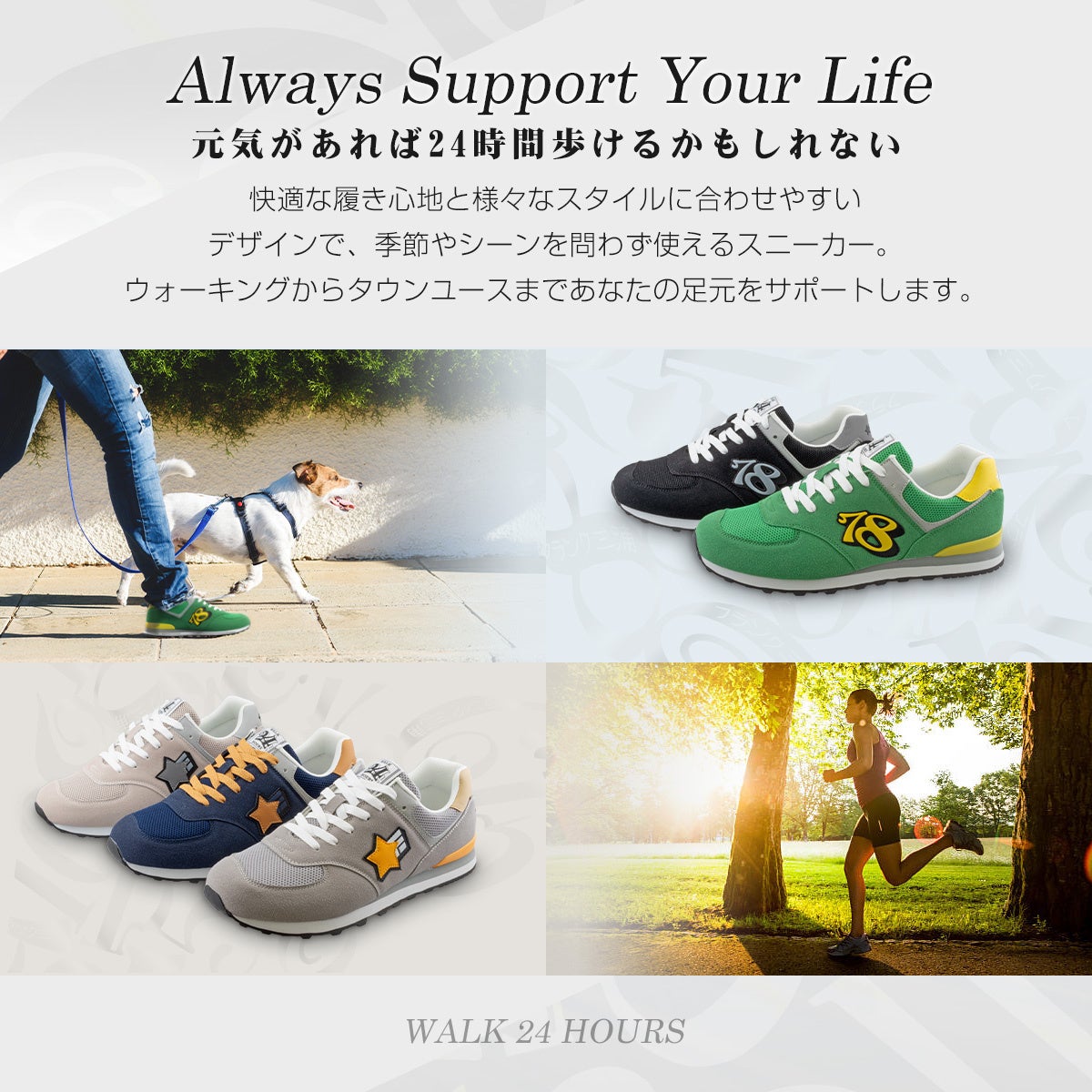 スニーカーとして最も大切な歩きやすさ、疲れにくさ、ムレにくさの3大要素は、品質向上の観点から非常に重要だと工場と何度も意見を交換しました。アッパーとタンの部分は水濡れ防止を兼ねて最小限のメッシュ穴加工を施し、空気の出し入れを可能にすることで、快適に履いていただける構造になっています。片方約350gの平均的重量ですが程良い密着感とスムーズな歩行運動を実現し、年齢問わず履いて頂けます。