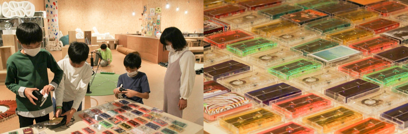 サウンドギャラリーには、来場者が録音・ジャケット制作したオリジナルのカセットテープと、様々なサウンドアーティストの楽曲が展示されています。 好きなジャケットで選んだり、タイトルから選んでみたり...聴いてみると思いもよらないサウンドとの出会いがあり、世代や家族を超えてここでしか聴けない音を共有します。