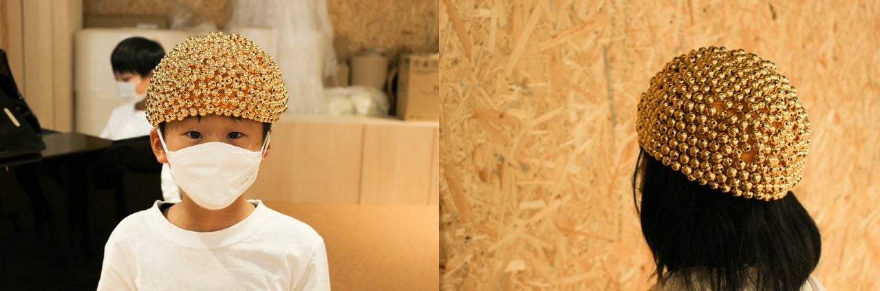 大仏さまの螺髪(らほつ)のような見た目の、たくさんの鈴がついた帽子。 飛んだり回ったり、頭を左右に振ってみたりすると、シャラシャラ音がします。 かぶっていると頭や耳が音で包まれる感覚に。