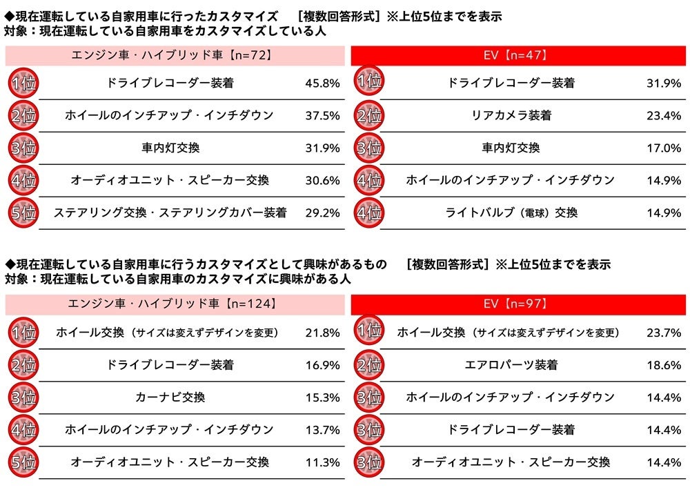 また、現在運転している自家用車のカスタマイズに興味がある人(221名)に、行うカスタマイズとして興味があるものを聞いたところ、エンジン車・ハイブリッド車オーナー、EVオーナーともに、1位「ホイール交換」(エンジン車・ハイブリッド車21.8%、EV23.7%)となり、エンジン車・ハイブリッド車では2位「ドライブレコーダー装着」(16.9%)、3位「カーナビ交換」(15.3%)、EVでは2位「エアロパーツ装着」(18.6%)、3位「ホイールのインチアップ・インチダウン」「ドライブレコーダー装着」「オーディオユニット・スピーカー交換」(いずれも14.4%)となりました。