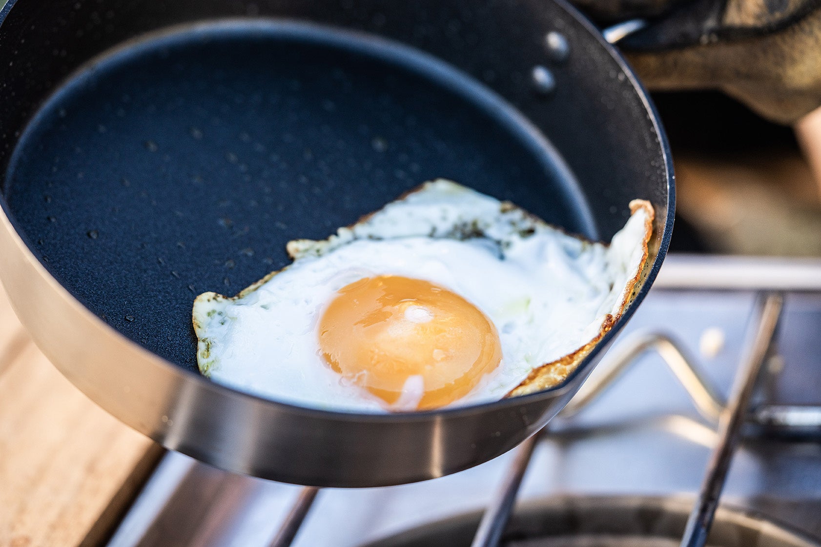 最大の特徴は、金物の街、新潟県燕三条の職人の技術を活かしたステンレス×アルミ×フッ素加工の3層構造により、焚き火も、IHも、ガスコンロも使用可能という点。これにより、「1焼く・2炒める・3煮込む・4炊く・5茹でる・6蒸す・7揚げる・8混ぜる・9盛る・10注ぐ」の10WAYを実現いたしました。焦げ付きにくく汚れが簡単に落ち、食洗機の使用も可能なため、洗い物の時短も嬉しいポイント。