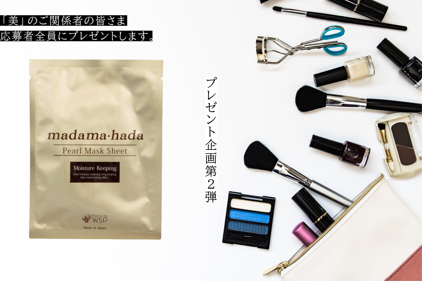 株式会社WSP[ダブルエスピー](本社所在地:東京都中央区、代表取締役社長:渡邊 雅夫)は、このたびプレゼント企画第2弾として、エステティックサロンや美容院の関係者様など「美」にまつわる方々を対象として、ご希望の方全員に、真珠美容液をたっぷり含んだ「真珠肌(madama・hada)スペシャルケア高保湿EGFマスクシート」をプレゼント致します。