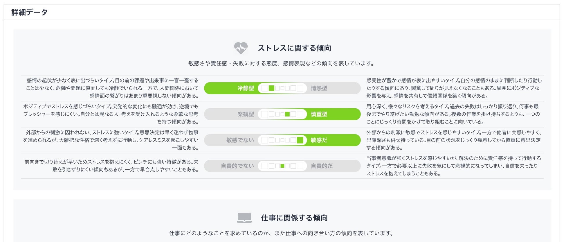 今までのミツカリの機能は、人や組織との相性を数値化し、相性の悪い価値観・考え方について採用面接時に「優先して質問すべき項目」として提示したり、面談時に「相手に伝わりやすいコミュニケーション方法」として提示したりする相性に特化した機能が中心でした。今回の個人結果機能では、適性検査受検者の人柄やストレスに対する強さを直感的に理解できるだけでなく、コミュニケーションの癖や得意な業務、マネジメントや意思決定などに関する価値観について提示することで、個人の人柄や性格・価値観を深く理解できるようになります。