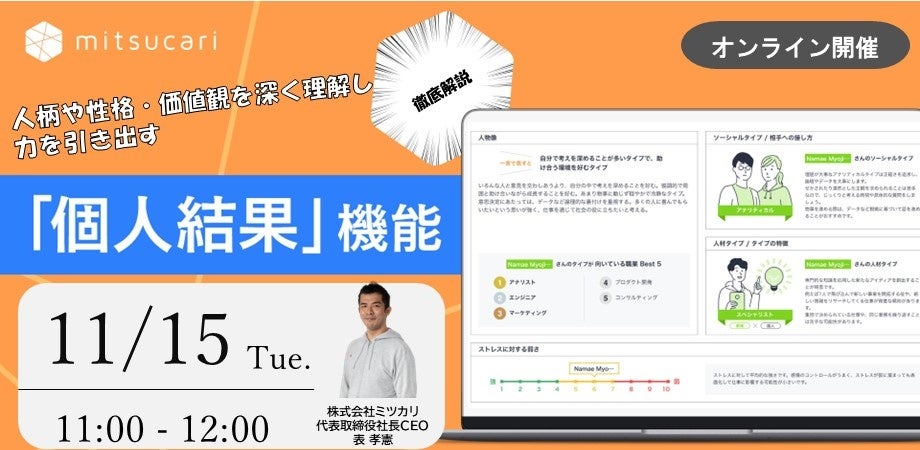 個人結果機能のリリースにあわせて、開発の背景や操作方法・分析結果画面の見方、業務における具体的な活用方法を解説する無料ウェビナーを11月24日(木)11時から開催いたします。