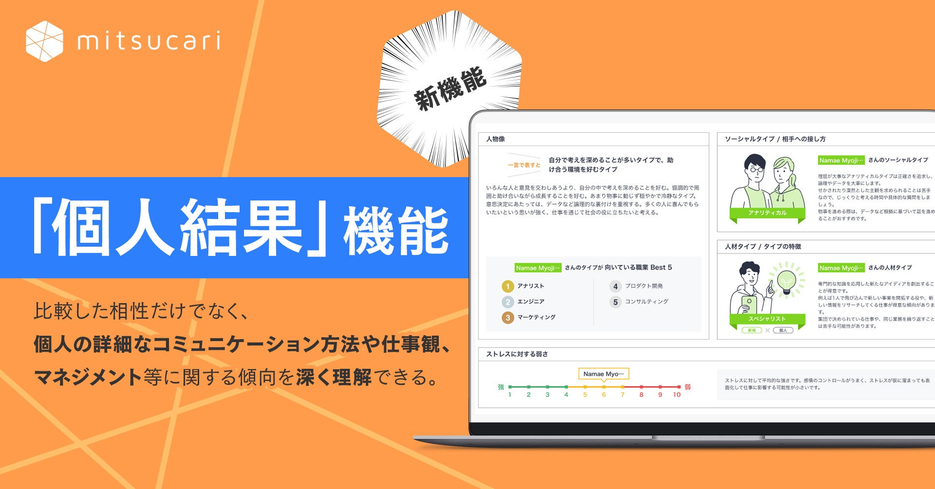 ひとりひとりの性格や相性を理解・分析して個と組織の力を最大化するHR Tech「ミツカリ」を提供する株式会社ミツカリ(本社:東京都渋谷区、代表取締役社長CEO:表 孝憲)は、2022年11月10日より、個人の性格・価値観や人柄を深く理解するための「個人結果」機能の提供を開始したことをお知らせいたします。