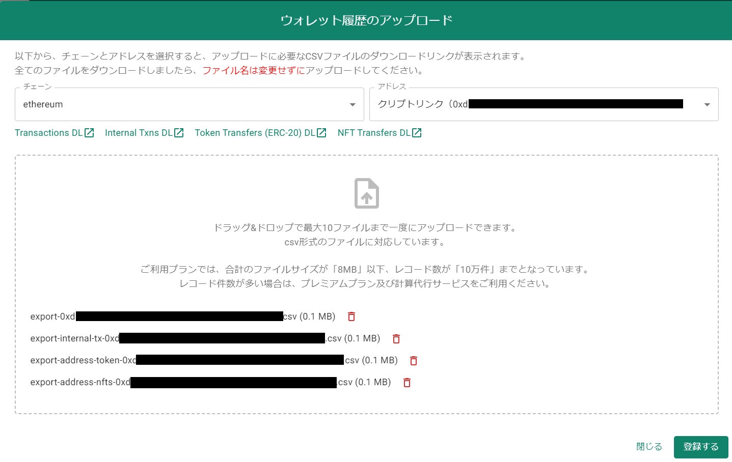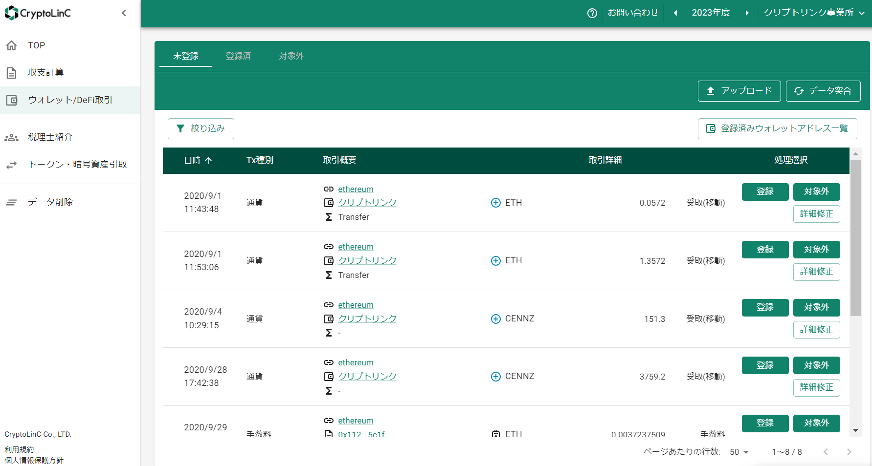ご利用されているウォレットアドレスを登録し、トランザクションのデータをアップロードすることにより、自動で取引内容を判別して、損益計算を行うことができます。