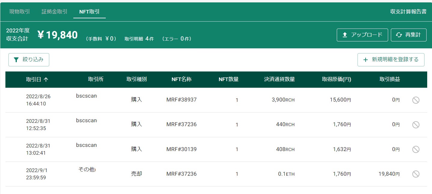 収支計算(NFT取引)の画面にて取引を行った情報が反映し、取得したNFTの情報が登録され損益が確認できます。