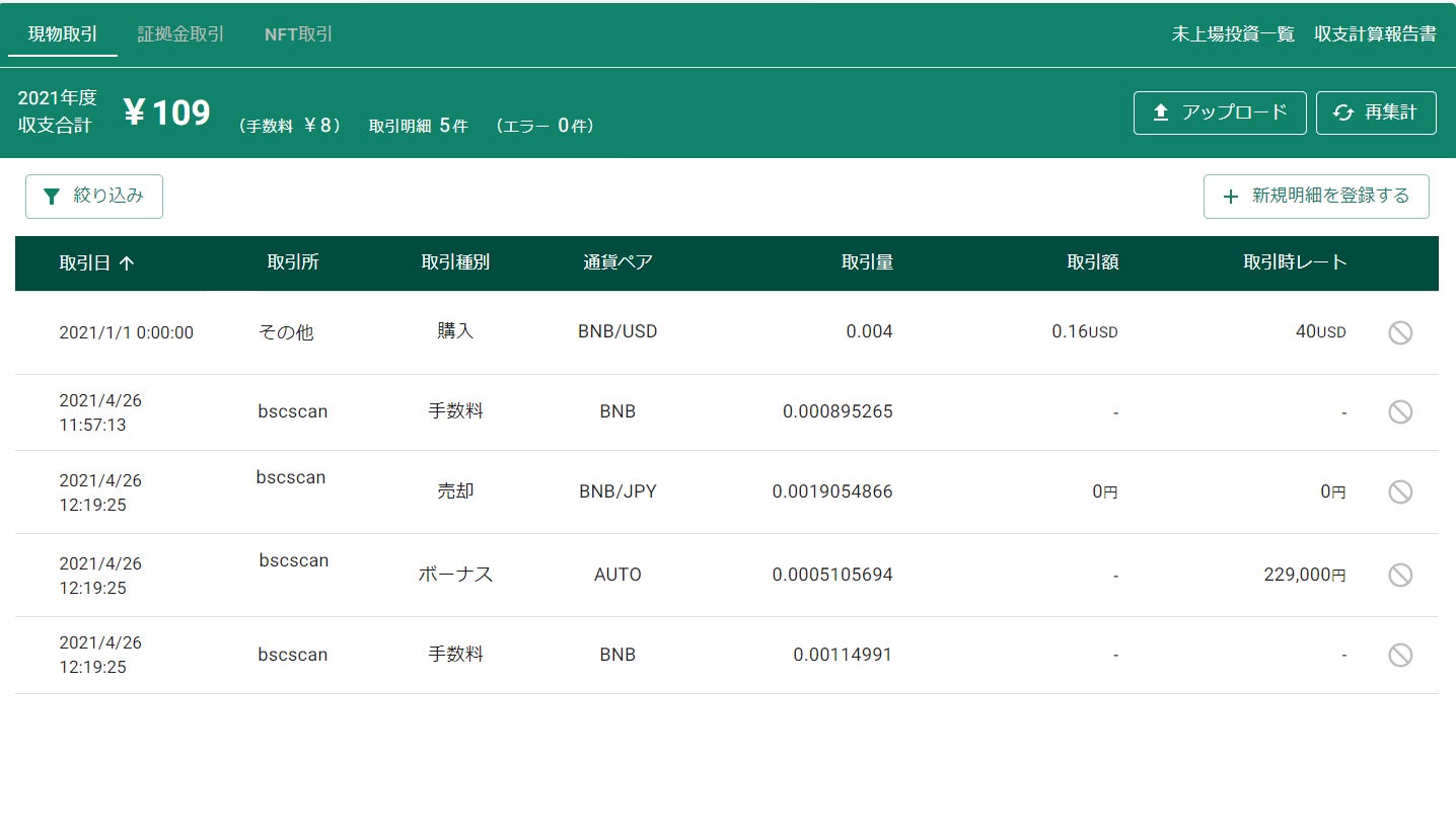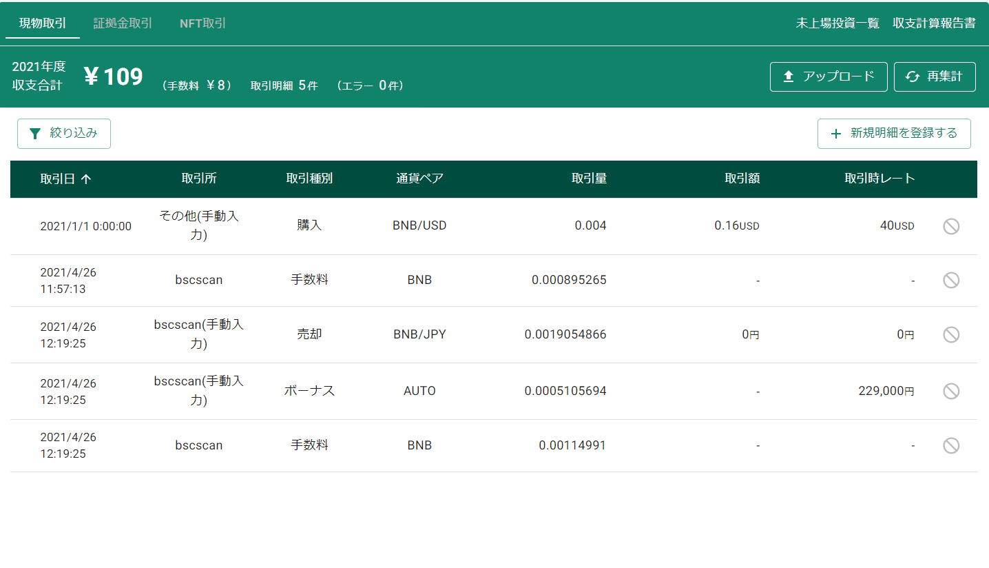 単一取引からなる売買や報酬などの明細は「登録」をクリックすると計算結果に反映されます。